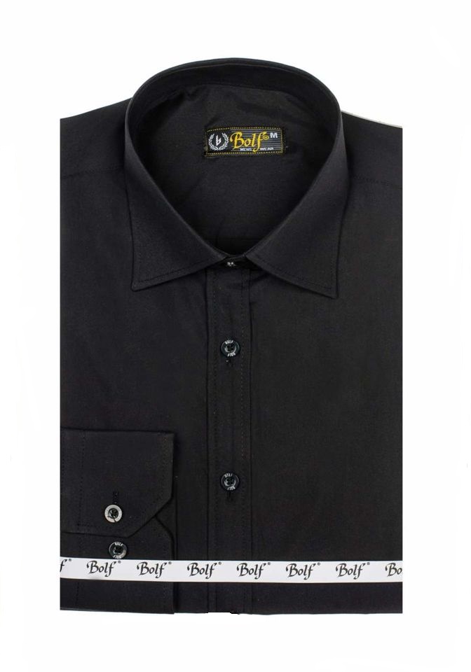 Crna muška elegantna košulja dugih rukava Bolf 1703 pozicija je koja bi trebala biti u ormaru svakog muškarca, a ne samo elegantnog muškarca. Ovaj model dostupan je u desetak više ili manje intenzivnih boja, što ga čini lako upariti s bezbroj casual i smart casual outfita. Obične muške košulje preporučuju se ljubiteljima minimalizma i klasične elegancije u modi. Udobne su i dobro sašivene. Definitivno must-have u ormaru svjesnog poslovnog čovjeka. Jednostavan, klasičan kroj u zanimljivim bojama čini ovaj model košulje savršenom kulminacijom mnogih svakodnevnih stilizacija. Košulja slim kroja, kopča se gumbima, ima praktičan zaobljeni porub. Rukavi su završeni širokim, podesivim manžetama koje se zakopčavaju na jedan gumb. Ima klasičan ovratnik s kratkim reverima.