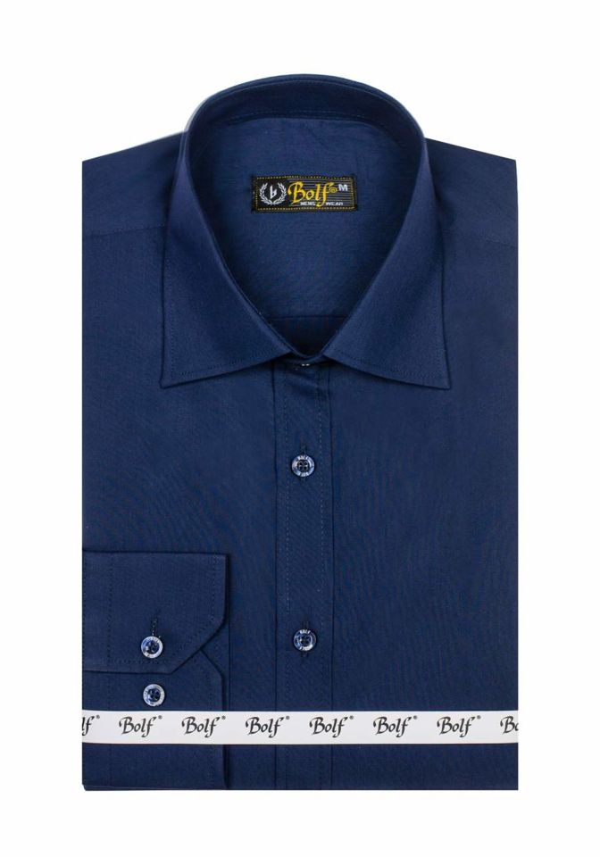 Tamnoplava muška elegantna košulja dugih rukava Bolf 1703 pozicija je koja bi trebala biti u ormaru svakog muškarca, a ne samo elegantnog muškarca. Ovaj model dostupan je u desetak više ili manje intenzivnih boja, što ga čini lako upariti s bezbroj casual i smart casual outfita. Obične muške košulje preporučuju se ljubiteljima minimalizma i klasične elegancije u modi. Udobne su i dobro sašivene. Definitivno must-have u ormaru svjesnog poslovnog čovjeka. Jednostavan, klasičan kroj u zanimljivim bojama čini ovaj model košulje savršenom kulminacijom mnogih svakodnevnih stilizacija. Košulja slim kroja, kopča se gumbima, ima praktičan zaobljeni porub. Rukavi su završeni širokim, podesivim manžetama koje se zakopčavaju na jedan gumb. Ima klasičan ovratnik s kratkim reverima.
