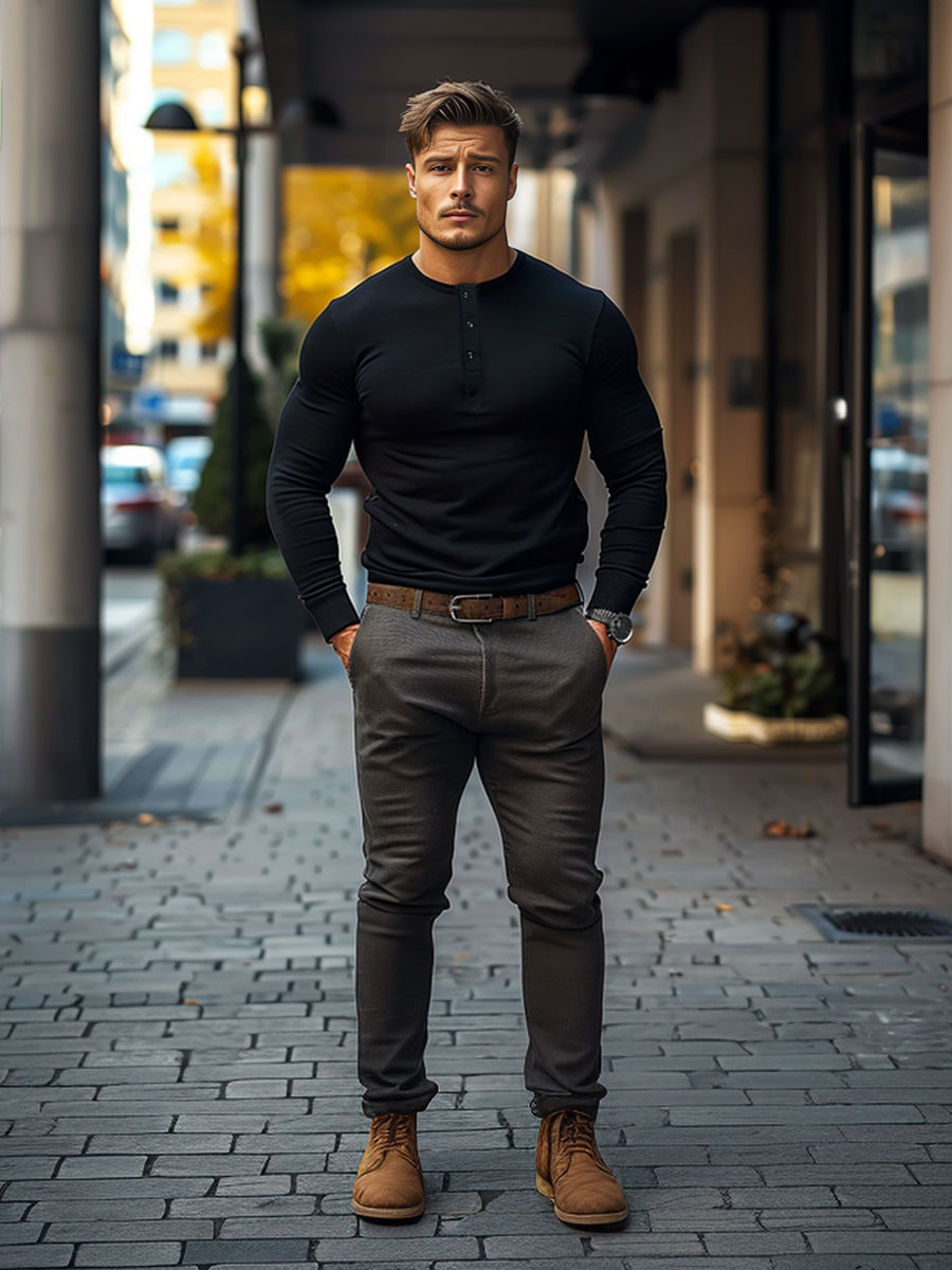 Basic crne majice dugih rukava, savršene za svakodnevnu upotrebu. Pamučne, tipa basic, s karakterističnim kopčanjem na gumb na dekolteu. Nosite crne Bolf muške duge rukave uz traperice, chinos hlače ili joggere. Nosite sa jaknom ili duksericom.