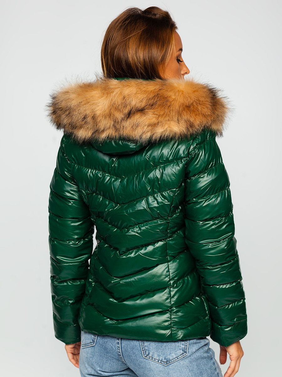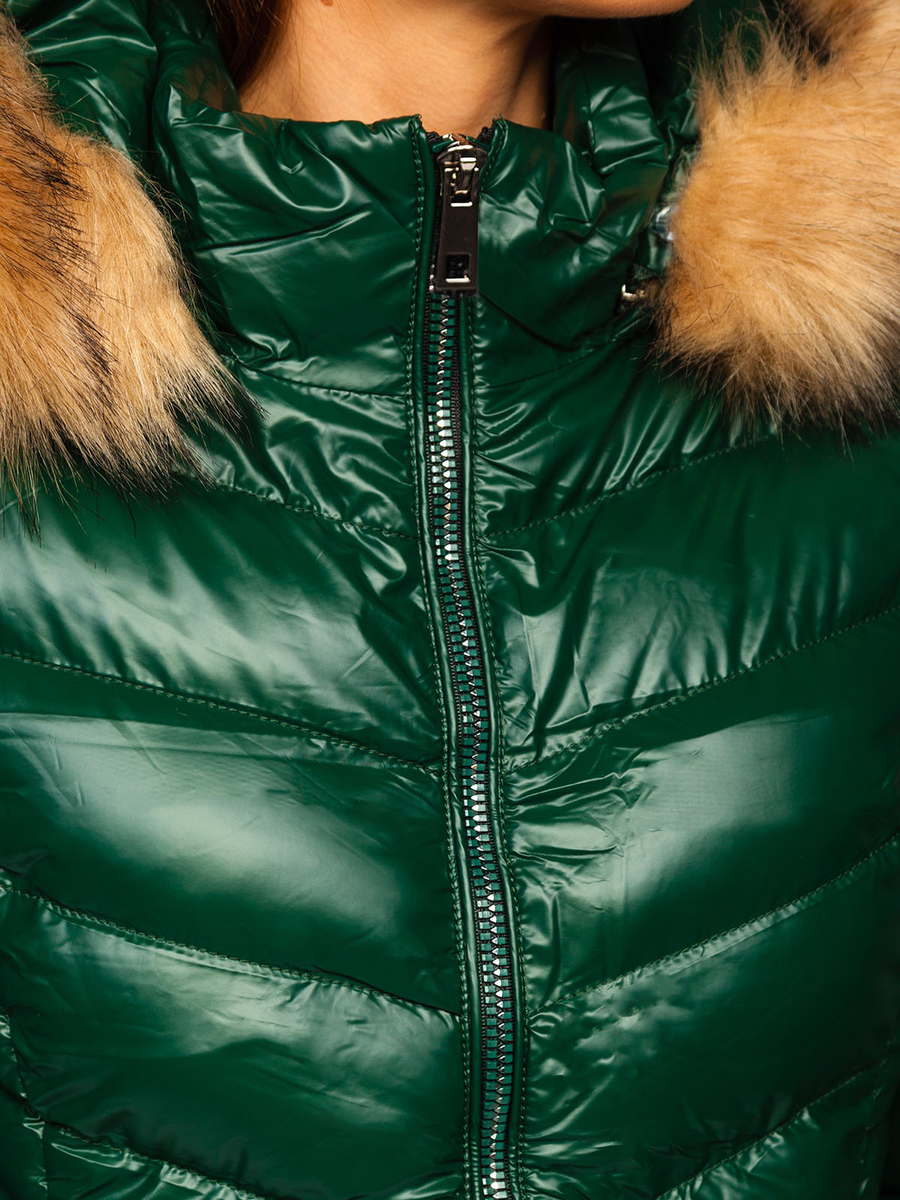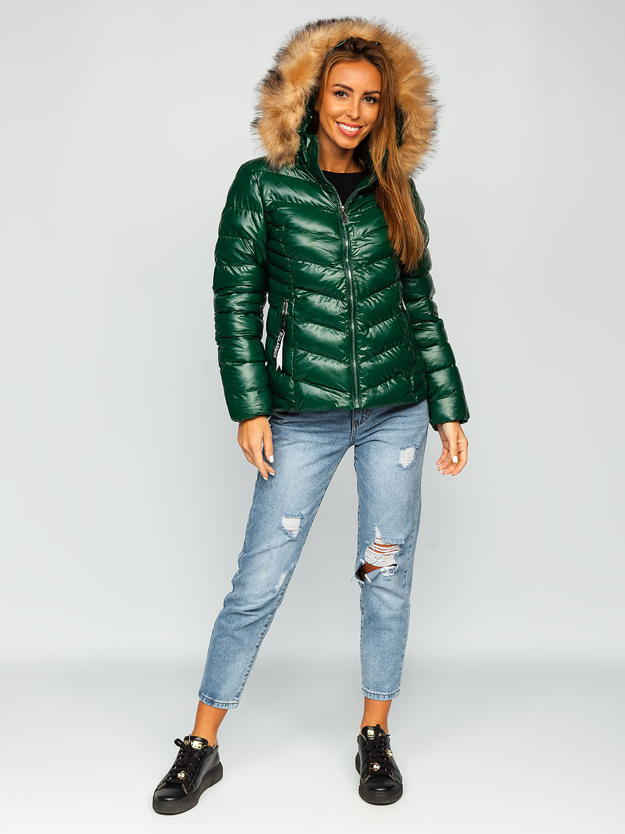Zelena prošivena ženska zimska jakna s kapuljačom Bolf 6830 idealna je za hladnije dane. Karakteristična osobina jakne je prošivanje na cijeloj površini. Jednostavan kroj, stojeći ovratnik i manšete na rukavima daju mu sportski look. Jakna ima odvojivu kapuljaču ukrašenu dekorativnim krznom, koje se također može skinuti. Ima dva praktična bočna džepa s patentnim zatvaračem i jedan unutarnji džep bez zatvarača. Proizvod se sastoji od 100% poliestera, zahvaljujući kojem je fleksibilan i udoban, može se prilagoditi bilo kojoj figuri. Bezvremenski kroj znači da vam jakna može služiti mnogo sezona. Raznolikost boja omogućuje vam da ga uskladite s mnogim stilizacijama. Zimska jakna savršena je za sportske stilizacije, u kojoj će se savršeno slagati s trenirkom i majicom. Savršeno će odgovarati trapericama ili tajicama .