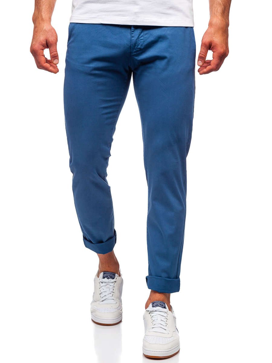 Indigo muške chino hlače Bolf 1146 savršen su izbor za muškarce koji cijene modu i dobar look. Ovaj klasični model hlača od materijala trebao bi se naći u svakom muškom ormaru. Chino hlače dolaze u nekoliko zanimljivih boja pa se mogu kombinirati s mnogim drugim elementima outfita. Za model su karakteristične manžete na krajevima nogavica koje hlačama daju poslovičnu opuštenost.