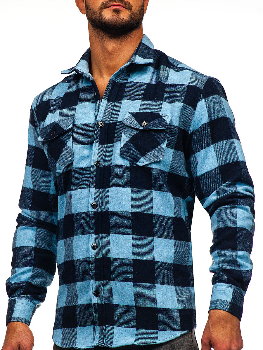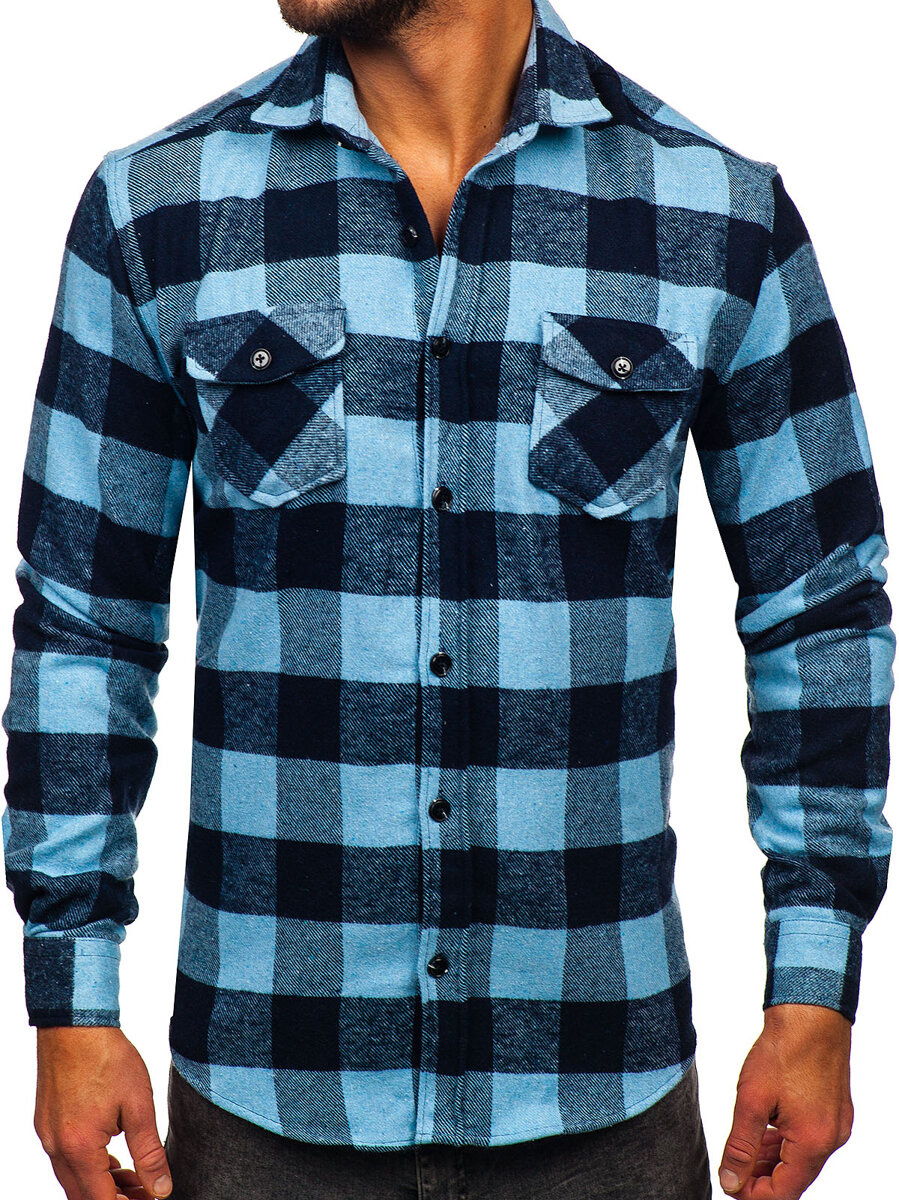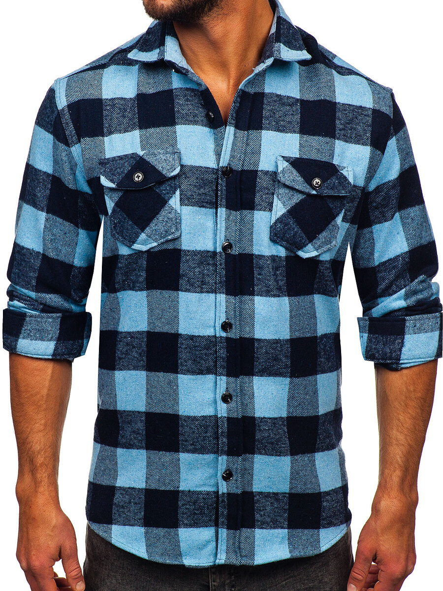 Muška svijetloplava flanelska košulja dugih rukava Bolf 20723 je proizvod na kopčanje s hai ovratnikom. Košulja ima dva elegantna džepa zakopčana na gumb. Donji dio košulje je zaobljen. Proizvod ima manšete koje se također zakopčavaju gumbom.<Br0 />Košulja ovog tipa bit će savršena za svaku priliku. Možete je odjenuti za sudar, gradski izlet ili spontani sastanak s prijateljima. Proizvod je univerzalan i može se kombinirati s bilo kojim odjevnim predmetom. Izrađen je od 65% pamuka i 35% poliestera, što ga čini ugodnim na dodir i fleksibilnim. Košulja se može nositi s trapericama i jogger hlačama.