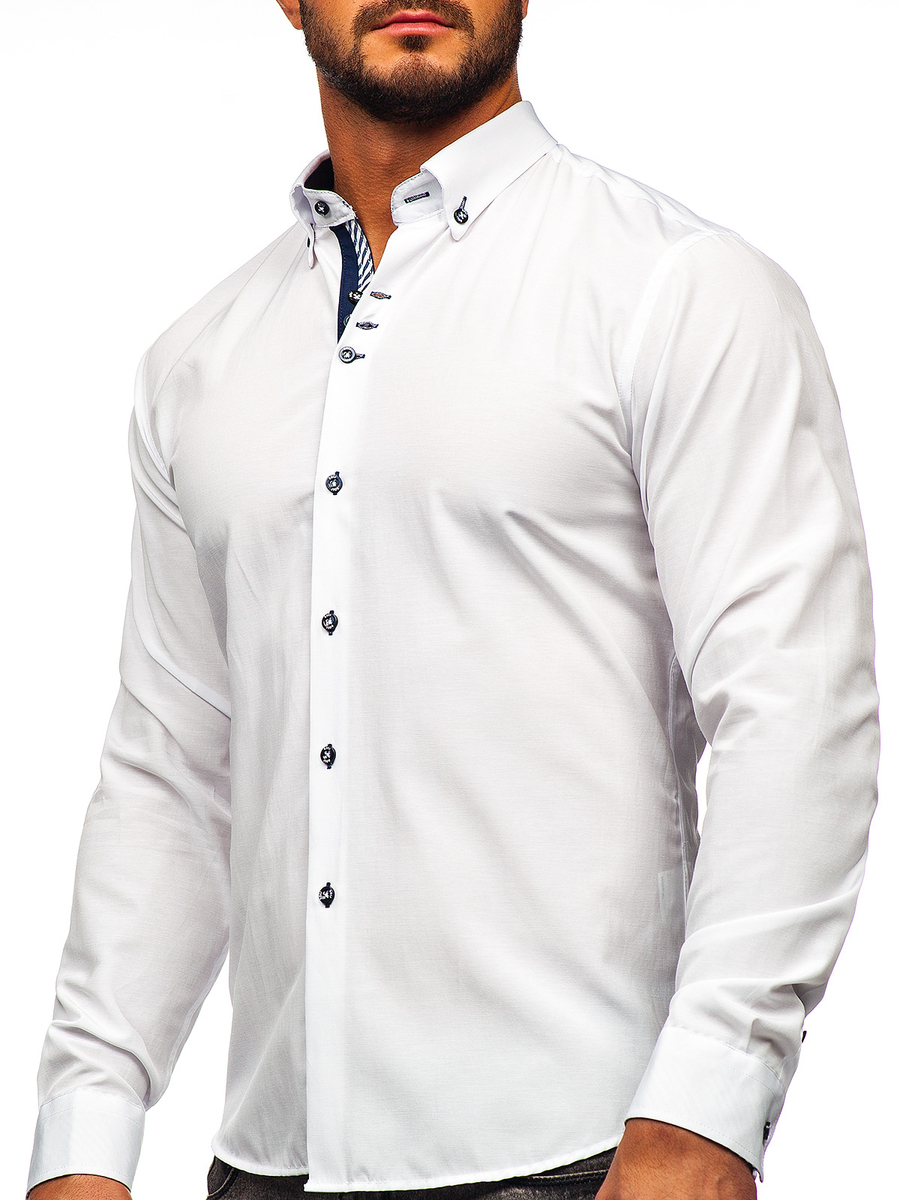 Bijele, elegantne muške košulje iz kolekcije Bolf . Lagane, lijepo pristaju uz mušku figuru. Slim fit košulja dugih rukava učinit će izgled s trapericama puno privlačnijim. Bijela košulja izgledat će iznimno elegantno u setu uz chinos hlače i sako.