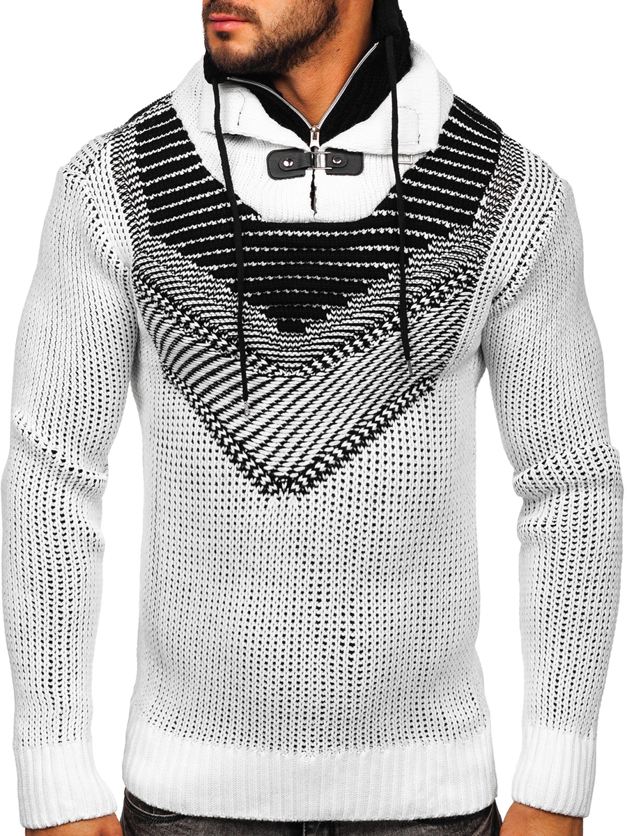 Bijeli debeli muški džemper sa stajaćim ovratnikom Bolf 2027 klasičan je pulover za osobe koje prate modne trendove. Džemper s uzorkom s ovratnikom podesivim patentnim zatvaračem, špagom i kopčom dat će karakter svakoj stilizaciji. Donji dio i rukavi su dovršeni remenom, koji naglašava casula karakter proizvoda Zahvaljujući manžetama, džemper savršeno pristaje svakoj figuri. Uklopljeni kroj čini da svi u njemu izgledaju iznimno povoljno. Proizvod je izrađen od nježne, ugodne na dodir tkanine koja savršeno pristaje uz tijelo. Materijal je 70% akril i 30% vuna. Nosite ga na posao, u školu, u kino, na spoj, u šetnju ili sastanak s prijateljima, bez obzira na prigodu, uvijek ćete izgledati sjajno. Klasični džemper odlično će pristajati uz traperice i kožnu jaknu , stvarajući savršenu odjeću za sastanak sa prijateljima. Možete ga upariti s joggerima i trenirkom za opušteniju stilizaciju.