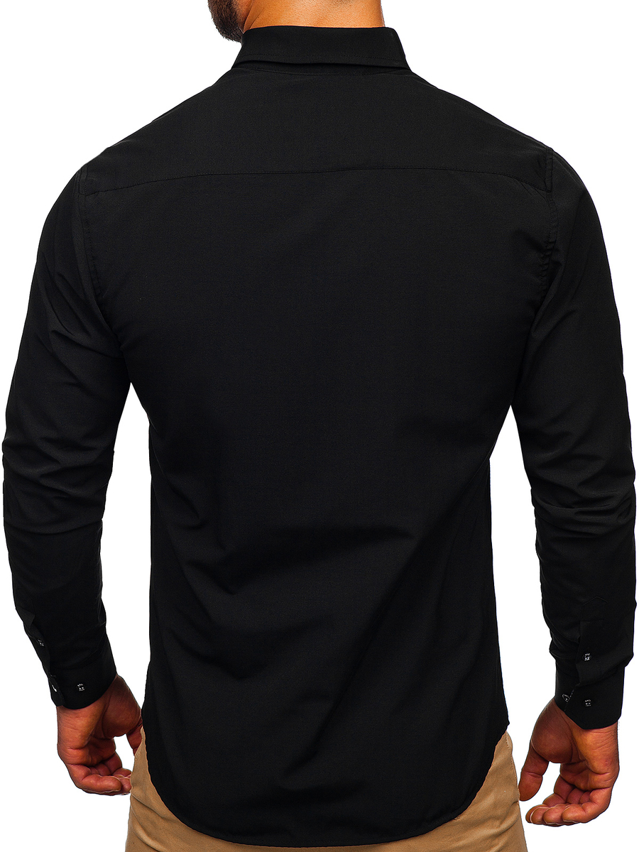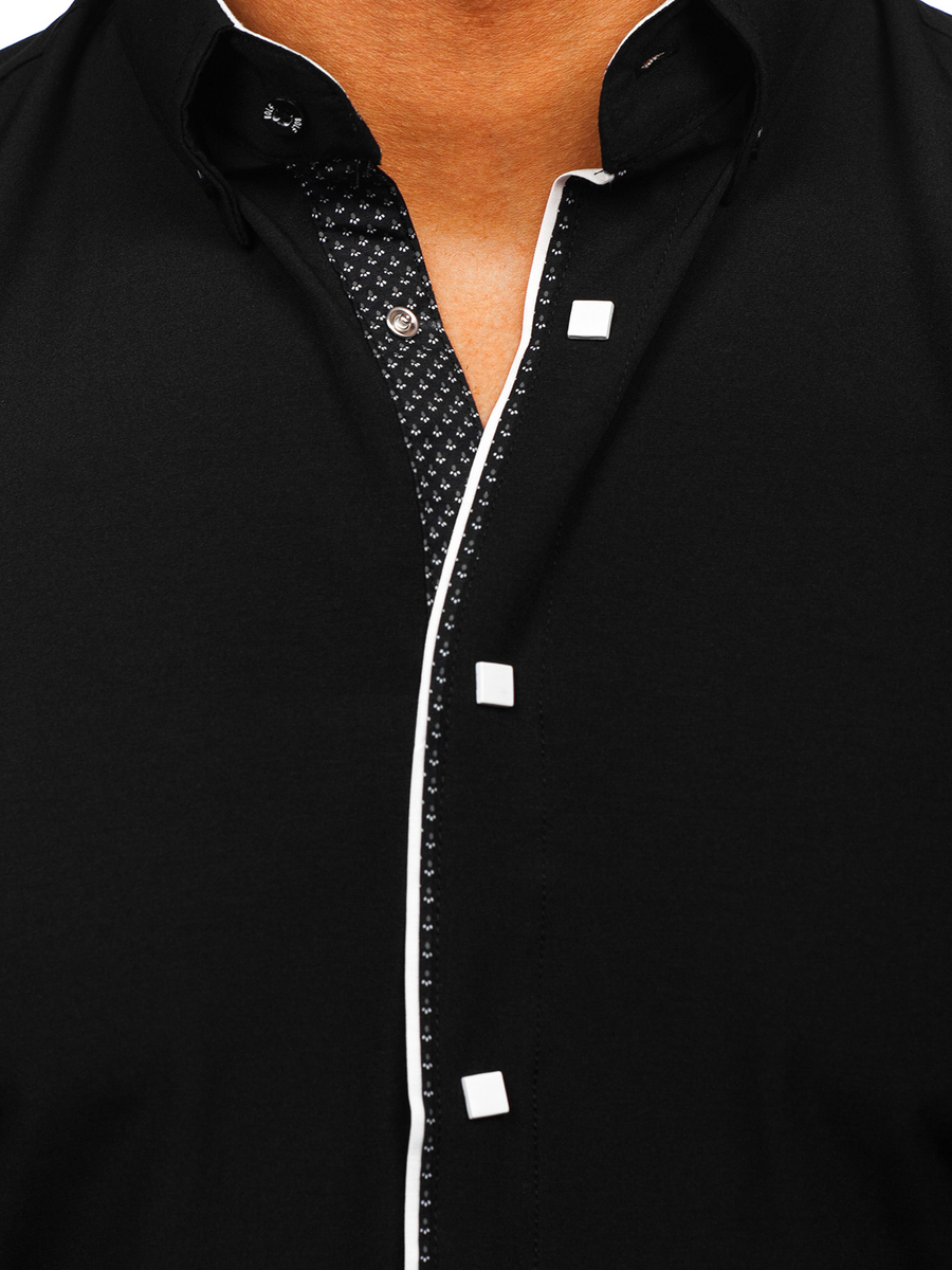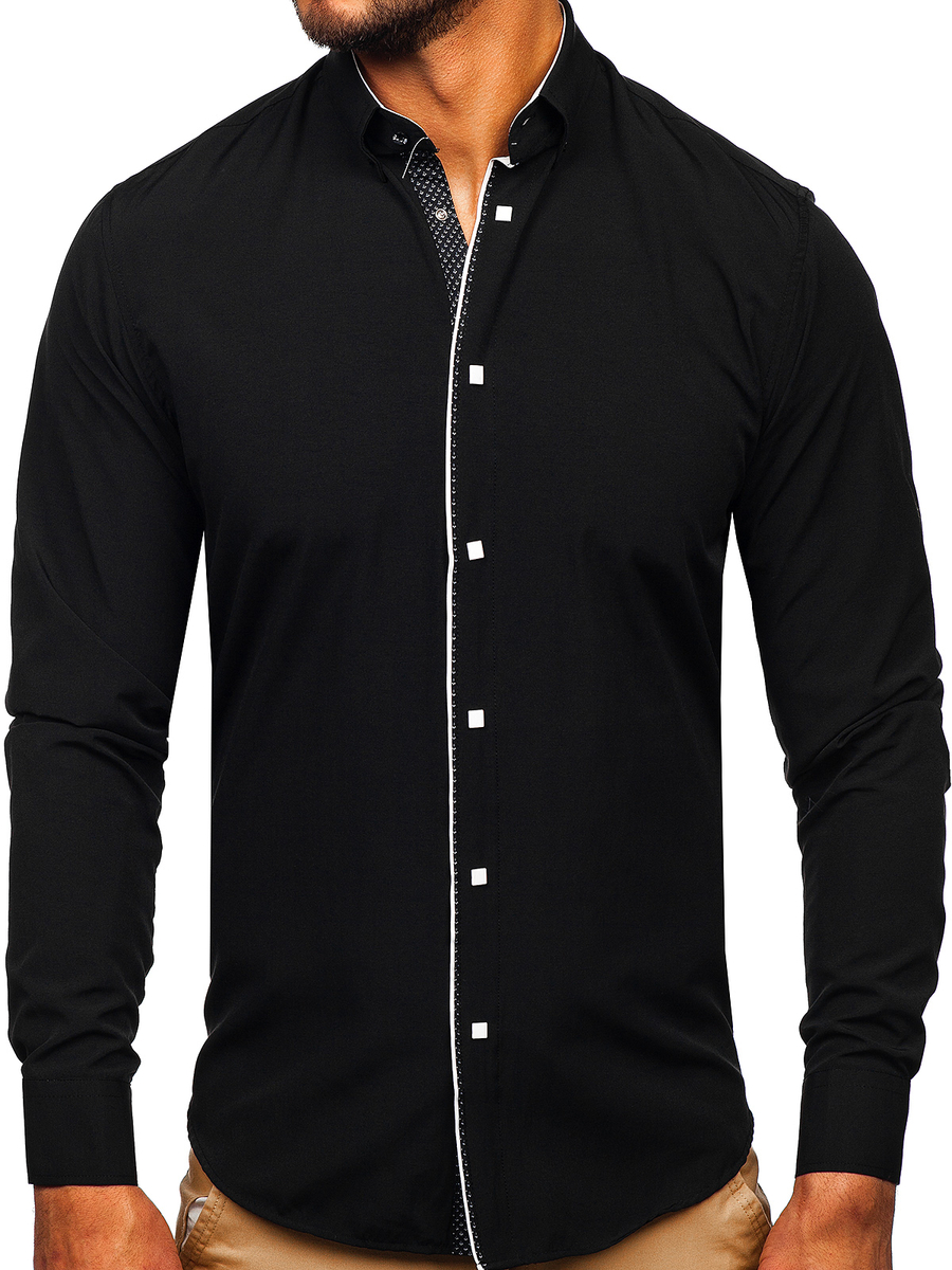 Crne košulje dugih rukava i kontrastnih detalja. Moderan, udoban, kvalitetan. Muška crna slim fit košulja Bolf izgleda sjajno uz traperice i chino hlače. Ima lijepu kragnu s gumbima. Savršeno za svakodnevnu, elegantnu odjeću.