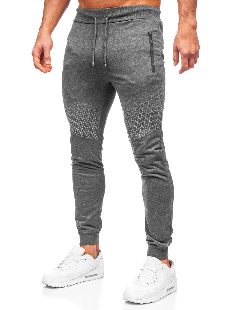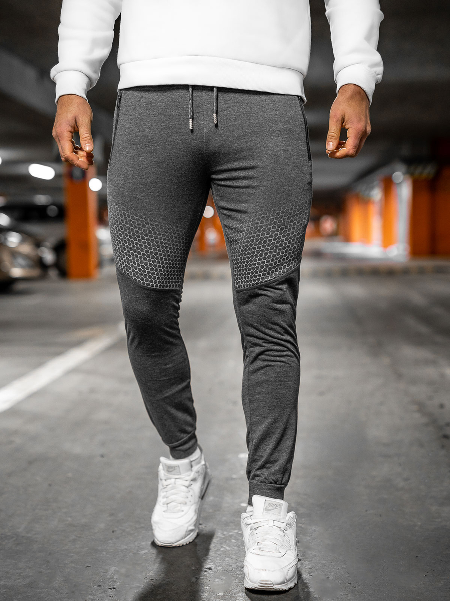 Muške grafitne trenirke Bolf HW2351 savršen su odabir bez obzira na godišnje doba. Hlače su podesive u struku konopom i jakim pojasom, zahvaljujući kojima ih možete prilagoditi kako bi savršeno pristajale vašoj figuri. Na prednjoj strani nalaze se dva džepa s patentnim zatvaračem i dodatni džep na stražnjoj strani. Jednostavan kroj i manžete na nogavicama daju im sportski izgled, koji ujedno griju u hladnijim danima. Ovaj model ima ukrasan print na nogavicama. Proizvod je izrađen od nježne, ugodne na dodir tkanine koja savršeno pristaje uz tijelo. Možete ih obući u teretani, u šetnju ili sastanak sa prijateljima. Kombinirajte ih s kožnom jaknom i longsleev za urbani izgled. Savršen za trenirku i majicu kratkih rukava za stvaranje sportske kombinacije.