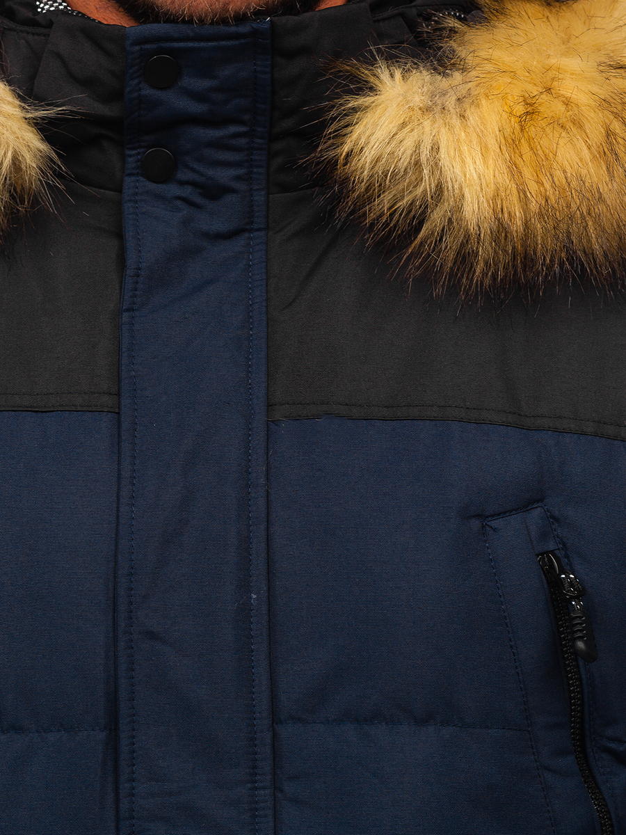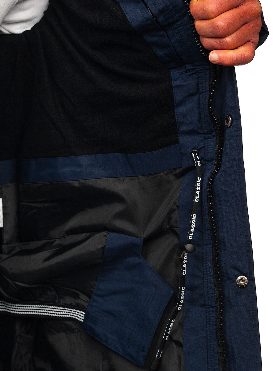 Tamnoplava skijaška muška zimska sportska jakna Denley 6400 kopča s patentnim zatvaračem i drukerima. Ima stojeći ovratnik, patent zatvarač i kopče i odvojivu, izoliranu s 2D podešavanjem kapuljaču, zahvaljujući kojoj ćete se zaštititi od vjetra i kiše. Na kapuljači je dodatno, odvojivo krzno. Uklopljeni kroj čini da svi u njemu izgledaju iznimno povoljno. Jakna ima dva džepa na prsima sa patentnim zatvaračima i dva džepa na dnu sa preklopom Uz to, jakna ima džep s kopčom na lijevom rukavu i jedan unutarnji džep s patentnim zatvaračem. Rukavi su podesivi rubom i čičak ,zahvaljujući čemu jakna savršeno pristaje uz figuru i štiti od hladnoće. Osim toga, jakna ima pojas za snijeg i dodatno podešavanje konopom s unutarnje strane. Savršeno za šetnju, sastanak s prijateljima ili gradski izlet. Uz njegovu pomoć stvorit ćete savršenu kombinaciju s trapericama i klasičnim džemperom .