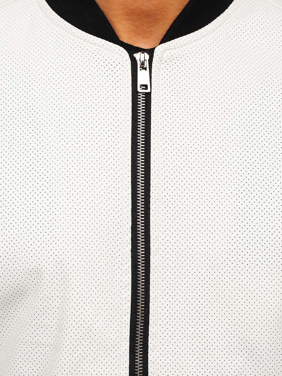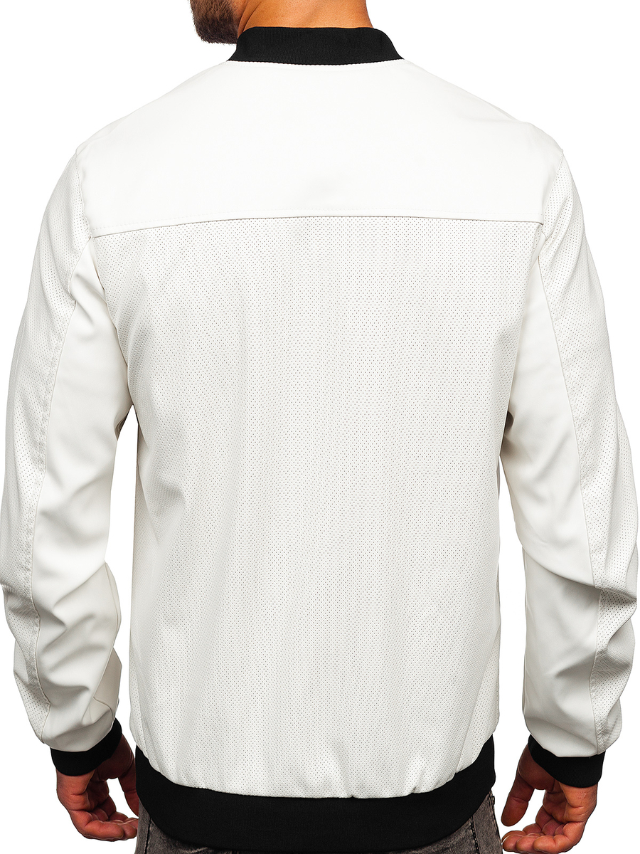 Bijela kožna jakna muška Bolf 7110 ima klasičan, ravan kroj. Zakopčava se patentnim zatvaračem i ima ovratnik koji je završen rubom . Dva vanjska džepa s patentnim zatvaračima i jedan unutarnji džep daju mu praktičan karakter. Donji dio i rukavi su završeni porubom koja pruža toplinu i zaštitu od vjetra . Kožna jakna je univerzalnog kroja i casual stila, što je čini prikladnom za svaku priliku. Izrađena je od od dva kombinirana materijala, ekološke kože. Izvrsno će izgledati u kombinaciji s joggericama , trapericama ili u ležernijem stilu s < a6> hlače trenirke .