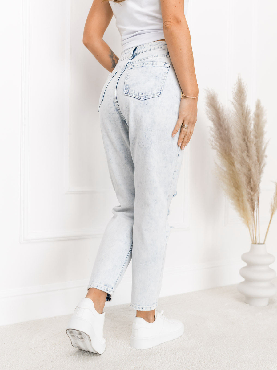Svijetloplave ženske mom fit traperice Bolf WL2102 su mom fit traperice koje savršeno ističu žensku figuru. Moderno sjenčanje i ogrebotine na nogavicama daju im jedinstven izgled. Proizvod je izrađen od najkvalitetnijih materijala, 98% pamuka i 2% viskoze, što ga čini izuzetno udobnim. Hlače imaju vrlo praktične džepove, tri sprijeda i dva straga. Traper hlače su univerzalna baza za izgradnju svakodnevnih stilizacija. Možete ih nositi u šetnji, u kupovini, na poslu ili na izletu s prijateljima. Savršen za stiliziranje uz majicu kratkih rukava , kožnu jaknu ili trenirku .