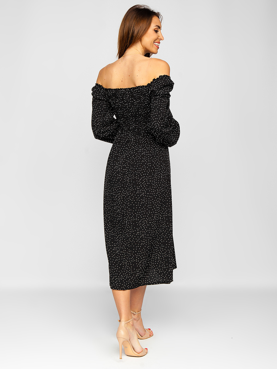 Ženska crna haljina na točkice Bolf DLY016 jedinstvena je ponuda za svaku ženu. Elegantna haljina na točkice savršeno naglašava figuru. Haljina ima elastični šav na prsima. Materijal ugodan na dodir daje osjećaj udobnosti i udobnosti tijekom nošenja. Rukavi imaju elastičnu traku, koja haljini daje jedinstven izgled. Možete ga nositi na zabavu, randevu ili na posao. U njemu ćete izgledati prekrasno bez obzira na okolnosti. Za večernji izlazak u grad kombinirajte haljinu s kaputom za elegantan karakter svoje odjeće.