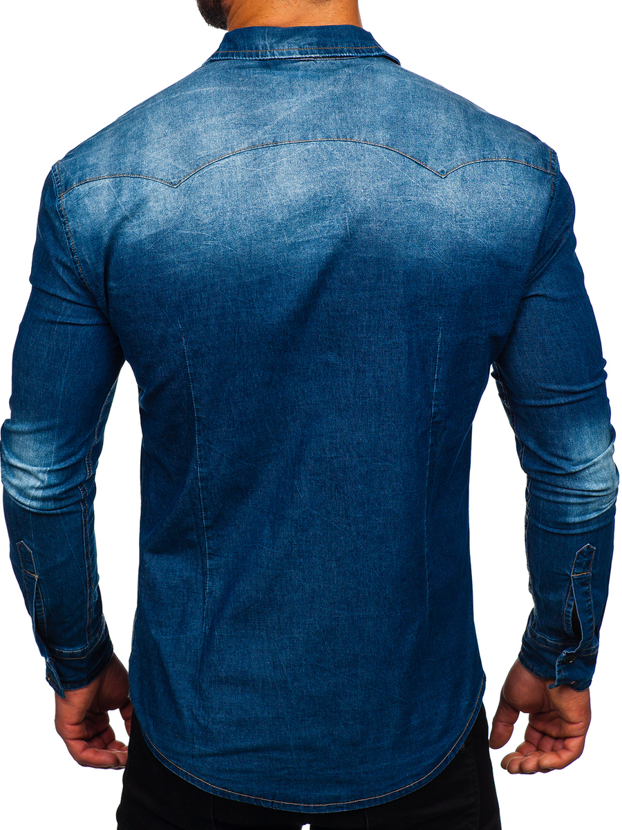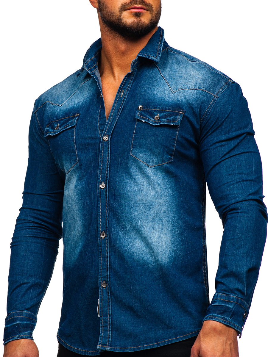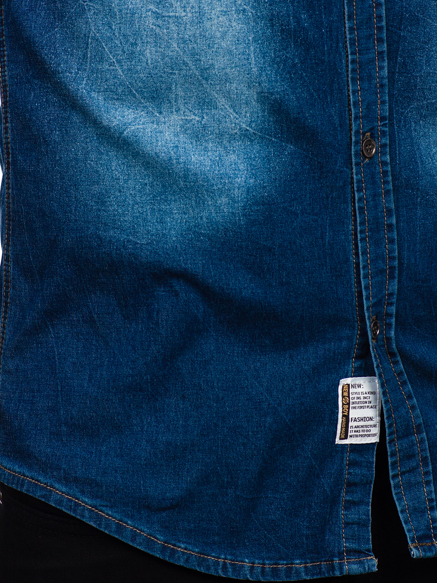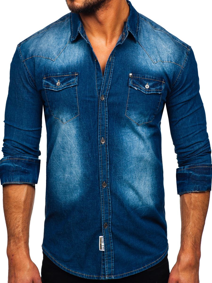 Niebieska koszula męska jeansowa z długim rękawem Denley MC704B to element garderoby każdego, eleganckiego mężczyzny. Koszula z długim rękawem, zapinana jest na guziki oraz posiada kołnierzyk "Hai". Uwielbiany przez naszych klientów fason z zaokrąglanym dołem koszuli świetnie dopasowuje się do sylwetki. Posiada regulowane, pojedyncze, zapinane na dwa guziki mankiety. Koszula posiada również dwie, praktyczne kieszenie piersiowe. Elementem ozdobnym jest mała aplikacja w kształcie czaszki przy kieszeni. Koszulę jeansową można wykorzystać podczas wielu okoliczności. Świetnie sprawdzi się podczas wyjść z przyjaciółmi do klubu, jak również podczas rodzinnego obiadu. Skomponuj swój elegancki look z chinosami oraz marynarką. Chcąc uzyskać bardziej casualowy outfit dobierz jeansy oraz kurtkę skórzaną, w takiej stylówce zawsze będziesz wyglądać modnie.