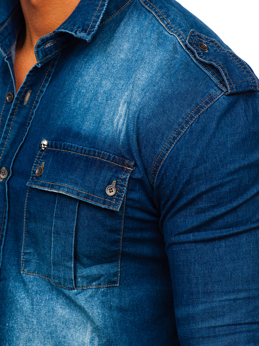 Svijetloplava muška traper košulja dugih rukava Bolf MC702BC definitivno je must have u svakom muškom ormaru. Izvanvremenska traper košulja dugih rukava, kopča se gumbima i ima ovratnik "Hai". Kroj, omiljeni našim kupcima, sa zaobljenim dnom košulje savršeno pristaje uz tijelo. Ima podesive, jednostruke manžete s dva gumba. Majica također ima dva praktična džepa na prsima. Dekorativni element je mala aplikacija u obliku lubanje uz džep. Traper košulja može se koristiti u mnogim okolnostima. Savršeno za izlazak s prijateljima u klub, kao i za vrijeme obiteljske večere. Napravite svoj elegantni izgled uz chinos hlače i jaknu . Za casual outfit odaberite traperice i kožnu jaknu , uvijek ćete izgledati moderno u ovom stilu.