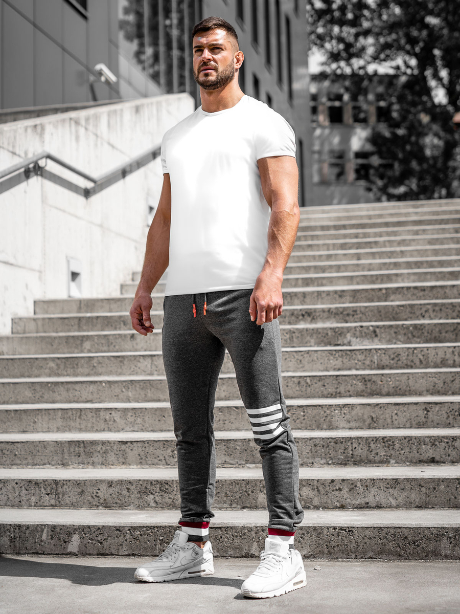Muške grafitne sportske hlače Bolf 7033 klasik su u najotmjenijem izdanju. Zahvaljujući prilagodbi u struku s jakim remenom i vezicom, trenirke će savršeno pristajati uz figuru. Rebra je također završena na nogama ukrasnim aplikacijama. Hlače imaju dva bočna džepa na patent zatvarač. Trenirku lako možete obući kada idete u teretanu, u šetnju ili s prijateljima u šank. Savršeni su za spontana putovanja izvan grada. Sastavite svoju sportsku odjeću s majicom , trenirkom i prslukom .