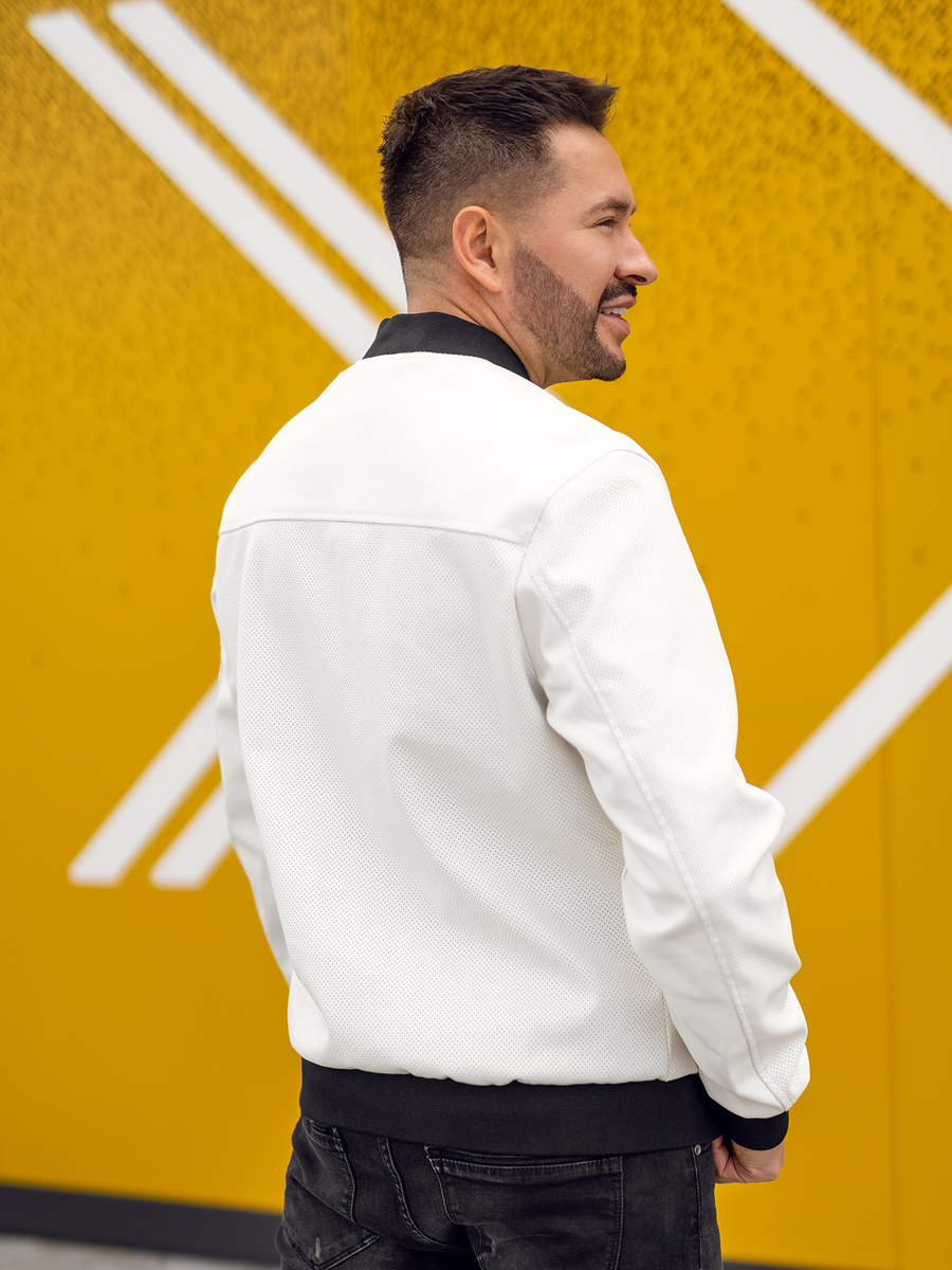 Bijela kožna jakna muška Bolf 7110 ima klasičan, ravan kroj. Kopča se patentnim zatvaračem i ima stojeći ovratnik završen trakom. Dva vanjska džepa s patentnim zatvaračima i jedan unutarnji džep daju praktičan karakter. Donji dio i rukavi završeni su rebrastim rubom koji vas grije i štiti od vjetra. Kožna jakna je univerzalnog kroja i casual stila, što je čini prikladnom za svaku priliku. Izrađena je od dva kombinirana materijala, ekološke kože. Izgledat će sjajno s joggericama, trapericama ili u ležernijem stilu s trenirkama.