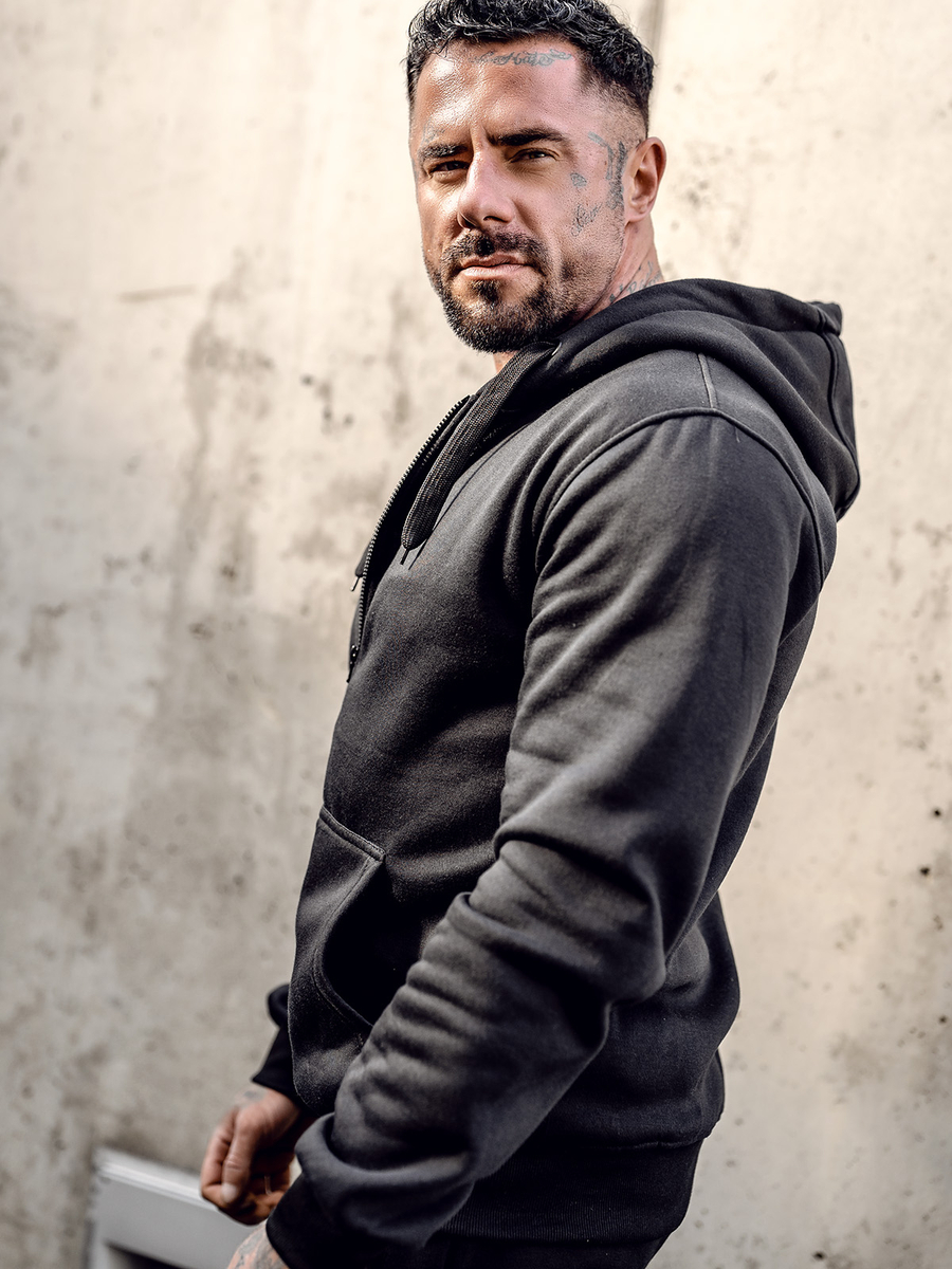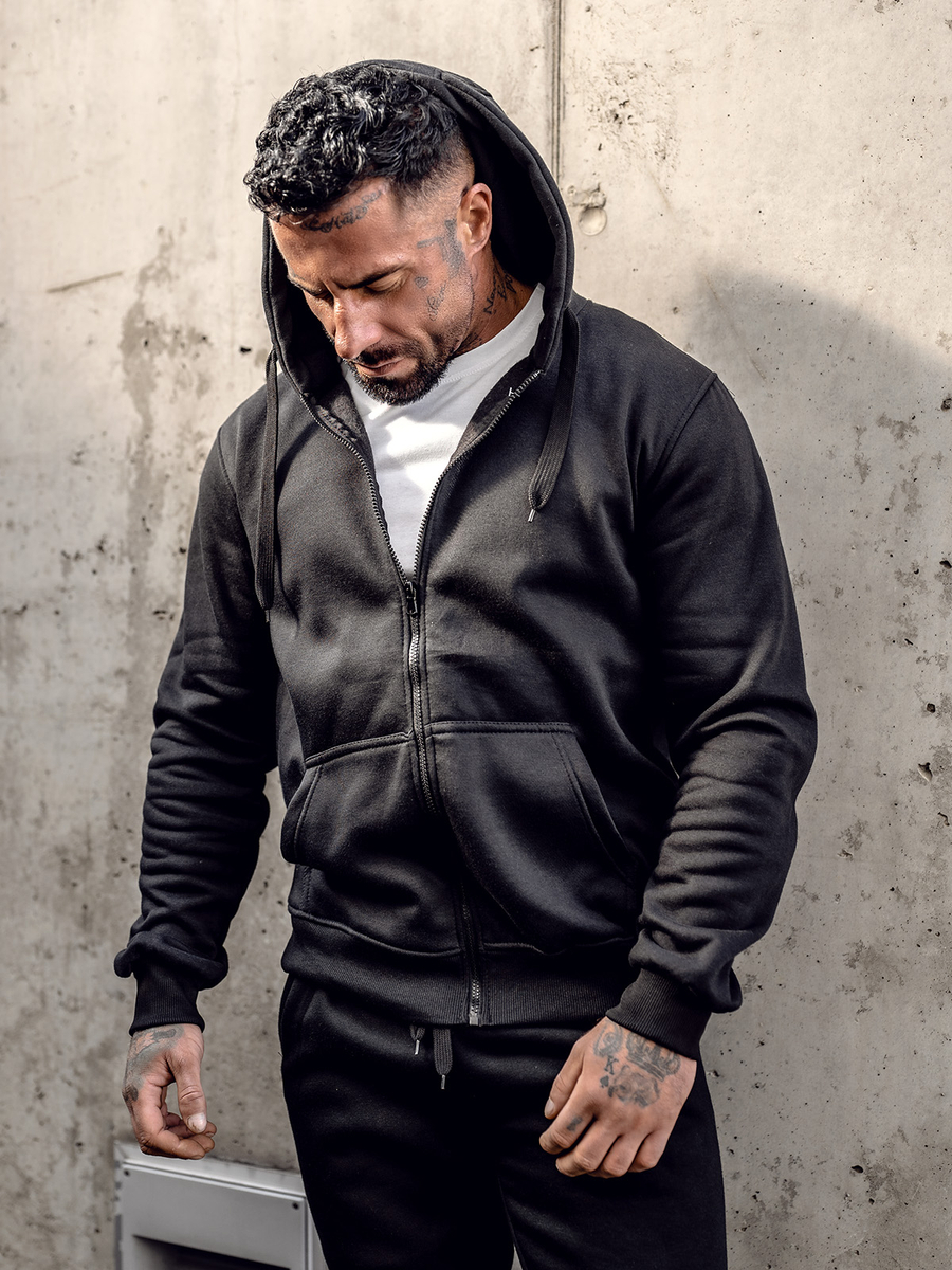 Muška crna dukserica s kapuljačom Bolf 2008A kopča se patentnim zatvaračem. Dukserica klasičnog kroja od mekane tkanine za trenirke ugodnog na dodir. Proizvod karakterizira mnoštvo izražajnih boja u kojima je dostupan. Ima jednobojnu podesivu kapuljaču i dva bočna džepa. Donji dio trenirke i rukavi završeni su jakim rubovima. Sweatshirt preporučamo prvenstveno ljubiteljima minimalizma i udobnosti u modi. Dobro je sašivena i udobna. Must have u modnoj muškoj garderobi. Jednostavan, klasičan kroj u zanimljivim bojama čini ovaj model dukserice savršenom kulminacijom mnogih svakodnevnih, uličnih i sportskih stilizacija. Glatki muški sweatshirt na otkopčavanje prijedlog je koji vrijedi imati u svom ormaru ne u jednoj, pa čak ni u višebojnoj varijanti. Od klasične crne, preko tamnoplave i crvene, do nešto ekstravagantnijih u bojama žute, narančaste ili ružičaste. Trenirka će funkcionirati u mnogim okolnostima u bilo koje doba godine.