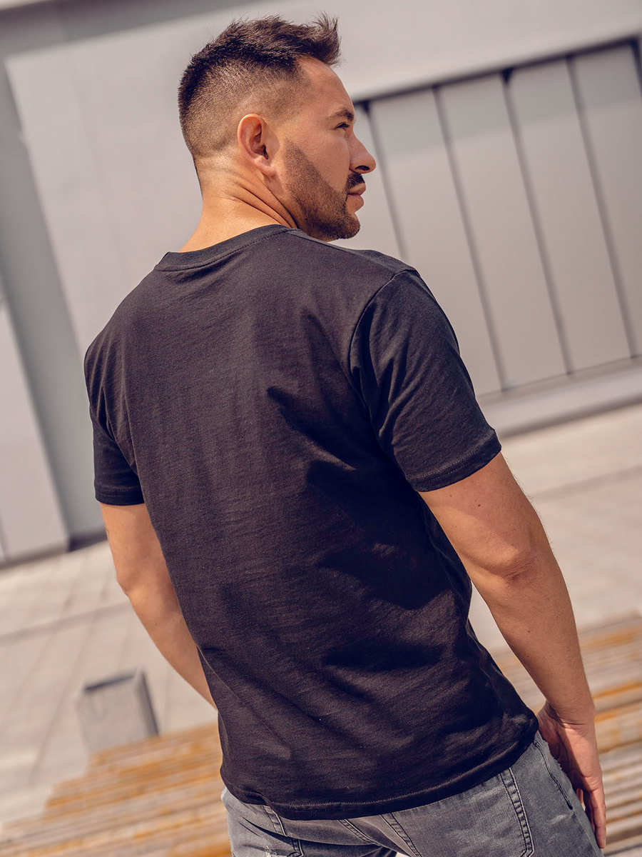 Crna pamučna muška majica s printom Bolf KS1997 pristajat će sjajno uz svaki stil!Prepoznatljivi print daje mu moderan karakter koji će upotpuniti vaš izgled. Majica ravnog kroja s okruglim izrezom pristaje svakoj figuri. Proizvod je izrađen od 100% pamuka, što ga čini nevjerojatno udobnim i prikladnim za svaku priliku. Majica kratkih rukava odlična je baza za kreiranje modernih stilova, bez obzira na priliku i godišnje doba.Uz kratke hlače stvara savršen urbani izgled za ljeto. S chinos hlačama stvara moderan, formalniji stil.