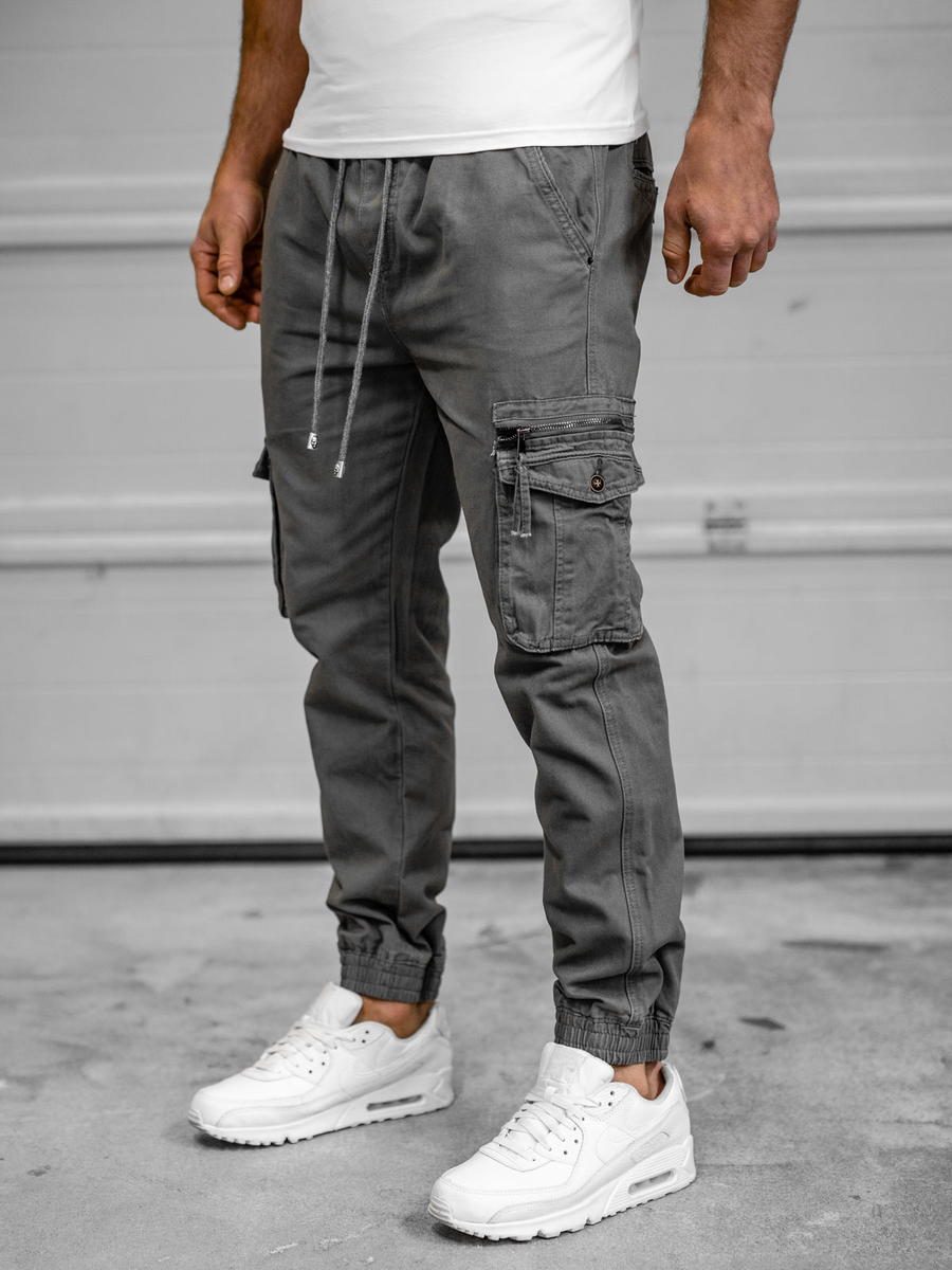 Muške grafitne cargo joggerice Bolf MP0181GA savršene su za kreiranje svakodnevnih kombinacija. Zahvaljujući prilagodbi struka s jakim rubom i uzicom savršeno pristaju uz figuru. Imaju klasične prednje džepove, stražnje džepove s gumbom i bočne džepove prekrivene preklopom i gumbom. Dekorativni element je moderna imitacija džepa s patentnim zatvaračem. Nogavice su završene elastičnim porubom, zahvaljujući kojem ne samo da izgledaju estetski, već i štite od hladnoće i vjetra. Izrađene su od 100% pamuka. Zahvaljujući najkvalitetnijem materijalu u njima ćete se osjećati ugodno. Joggers će izgledati sjajno s majicom i trenirkom.