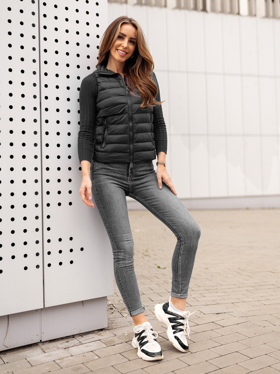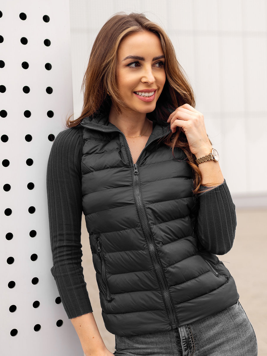 Ženski crni prošiveni prsluk Bolf 23077A bit će savršen za kreiranje sportske kombinacije. Ovaj prošiveni prsluk klasičnog kroja bit će izvrsna alternativa jakni u jesenskoj sezoni, pružajući zaštitu od hladnoće i vjetra. Zakopčava se patentnim zatvaračem i ima stojeći ovratnik. Dva vanjska džepa s patentnim zatvaračima daju mu praktičan karakter. Izrađen je od 100% najlona, tako da ćete se u njemu osjećati iznimno ugodno. Izgledat će sjajno uz trenirke stvarajući sportski, opušteni outfit. Jednako savršeno pristajetrapericama. Možete ga nositi na trenirku ili majicu !
