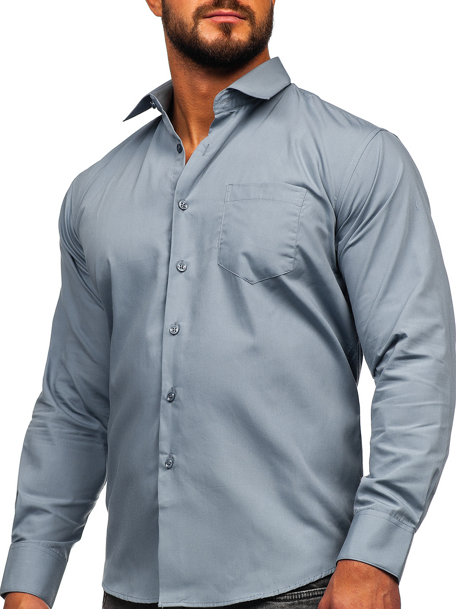 Antracit elegantna muška košulja dugih rukava Bolf M14 je must have u ormaru svakog elegantnog muškarca. Košulja dugih rukava na kopčanje i talijanskog ovratnika. Ima podesive, jednostruke, zakopčane manžete. Klasična košulja sa zaobljenim porubom ima mali, praktičan džep na prsima. Savršeno za izlazak s prijateljima u klub, kao i za vrijeme važnog sastanka. Basic karakter košulje omogućuje stvaranje mnogih stilova za svaku priliku. Stvorite svoj vlastiti elegantni izgled uz chinos hlače i sako . Za ležerniji outfit odaberite traperice i kožnu jaknu.