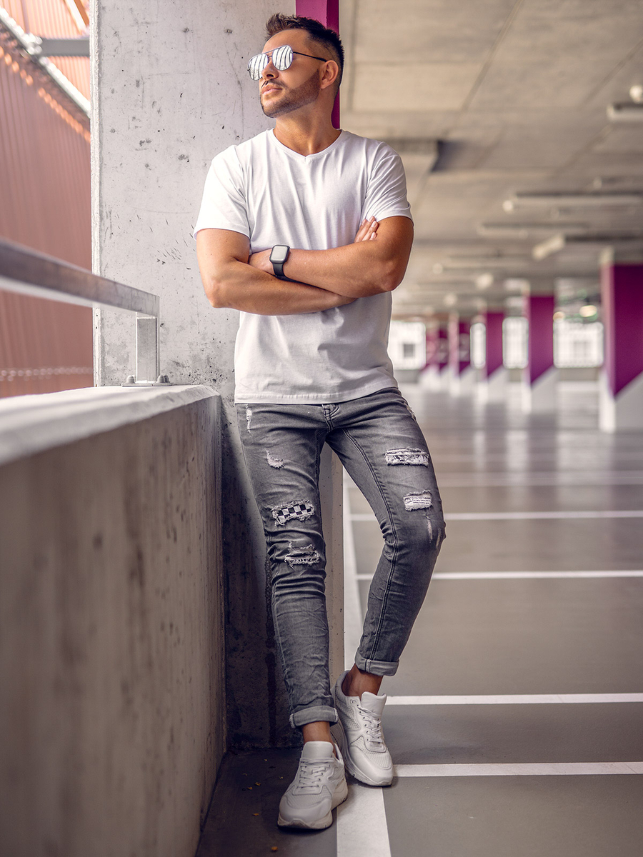 Obična majica kratkih rukava Bolf 192131A s V izrezom. Bijela majica. Lijepo pristaje svakoj figuri i dobro prianja uz tijelo otkrivajući mišiće. Izrađen je od lijepog, mekanog materijala. Ovaj model je dostupan u nekoliko klasičnih boja i može se kombinirati s mnogim drugim bojama i uzorcima.