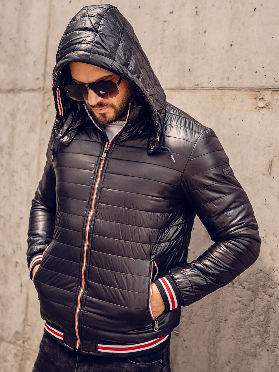 Crna prošivena prijelazna muška jakna Bolf 6191A ima originalne ukrase na manšetama i kapuljači, što je čini prepoznatljivom i uočljivom. Jakna ima moderne vodoravne prošivenja po cijeloj površini. Zakopčava se patentnim zatvaračem i ima stojeći ovratnik. Rukavi, ovratnik i donji dio jakne završeni su širokim, crnim rupicama, sa bijelo crvenim ukrasima, šta dodaje jakni sportski karakter. Imaju dva praktična vanjska džepa s patentnim zatvaračima. Odvojiva kapuljača, podesiva vezicom