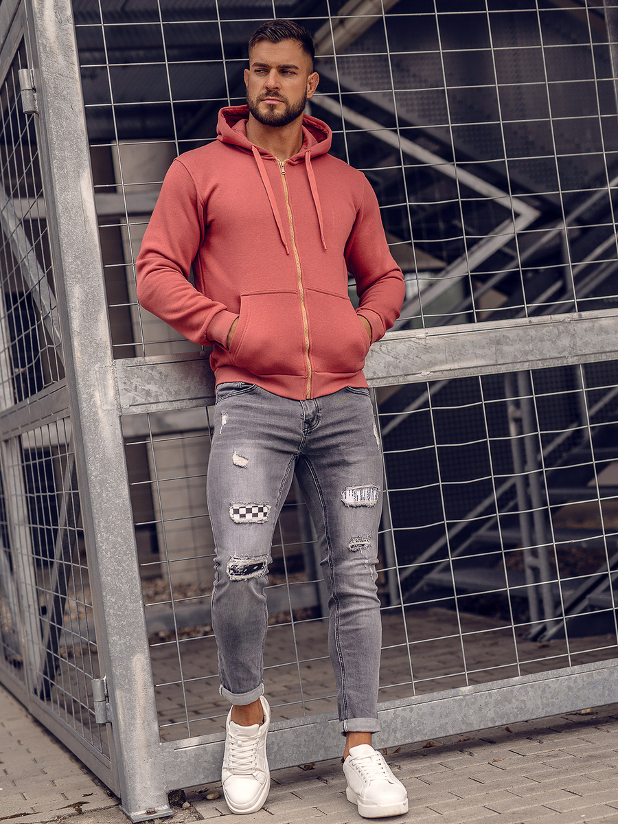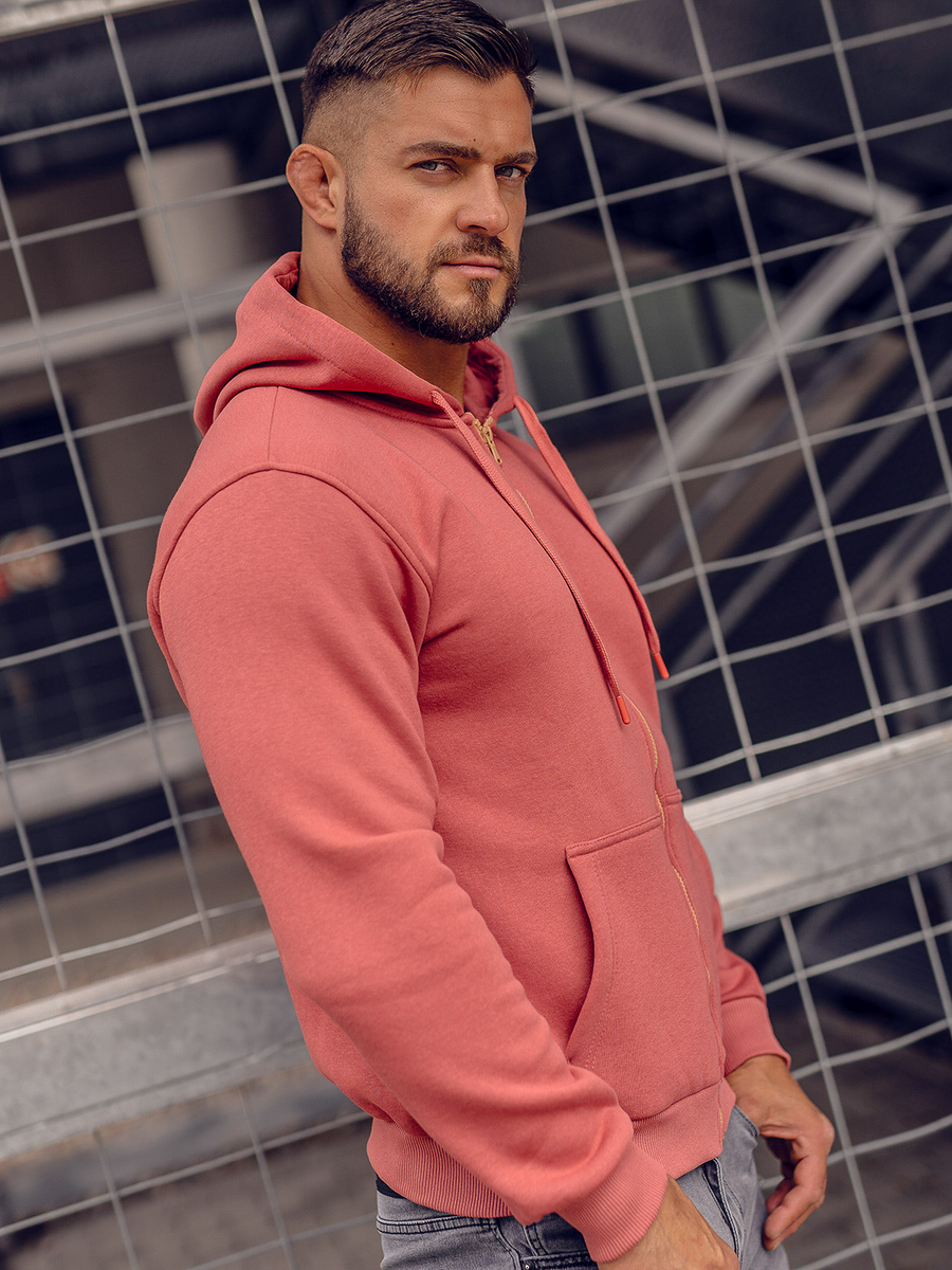 Muška dukserica s kapuljačom boje lososa Bolf 2008A kopča se patentnim zatvaračem. Dukserica klasičnog kroja od mekane tkanine za trenirke ugodnog na dodir. Proizvod karakterizira mnoštvo izražajnih boja u kojima je dostupan. Ima jednobojnu podesivu kapuljaču i dva bočna džepa. Donji dio trenirke i rukavi završeni su jakim rubovima. Sweatshirt preporučamo prvenstveno ljubiteljima minimalizma i udobnosti u modi. Dobro je sašivena i udobna. Must have u modnoj muškoj garderobi. Jednostavan, klasičan kroj u zanimljivim bojama čini ovaj model dukserice savršenom kulminacijom mnogih svakodnevnih, uličnih i sportskih stilizacija. Glatki muški sweatshirt na otkopčavanje prijedlog je koji vrijedi imati u svom ormaru ne u jednoj, pa čak ni u višebojnoj varijanti. Od klasične crne, preko tamnoplave i crvene, do nešto ekstravagantnijih u bojama žute, narančaste ili ružičaste. Trenirka će funkcionirati u mnogim okolnostima u bilo koje doba godine.