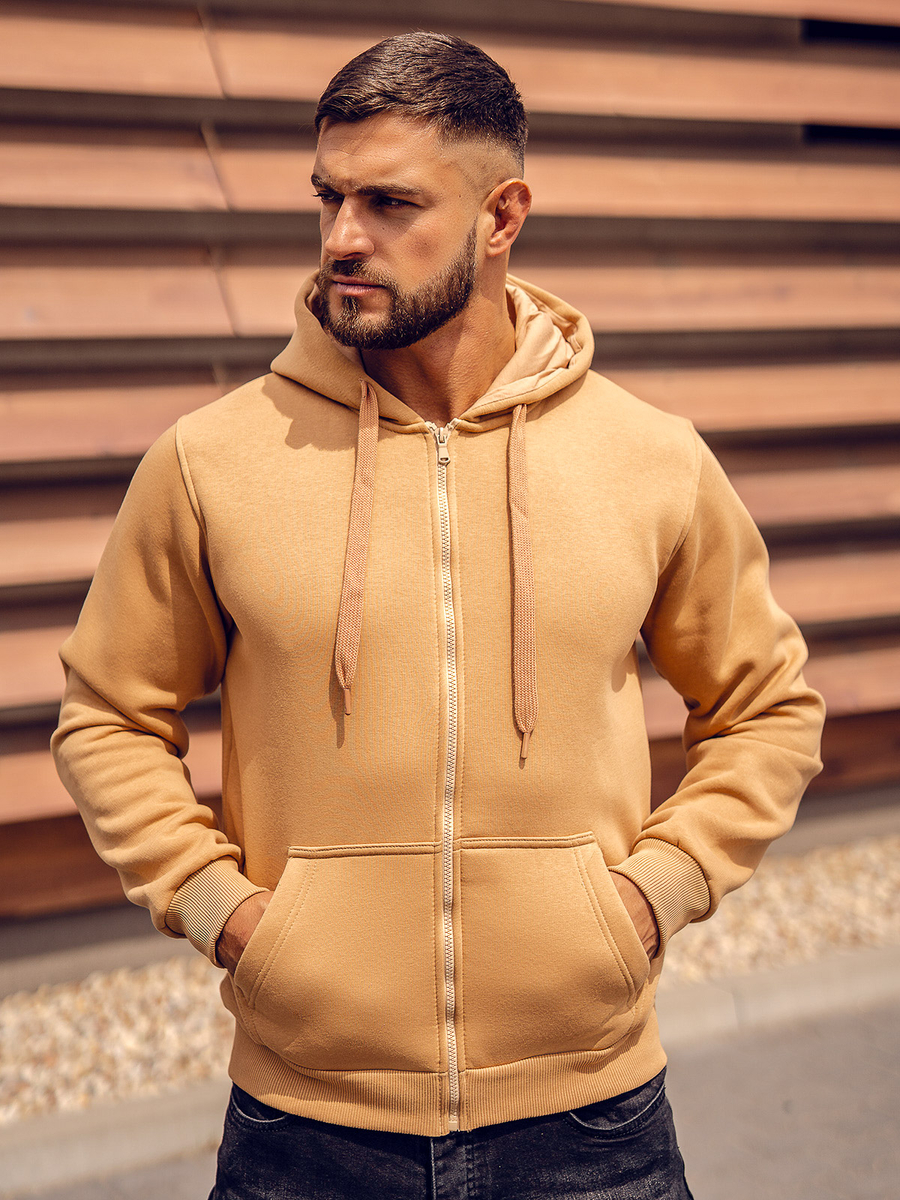 Muška smeđa dukserica s kapuljačom Bolf 2008A kopča se patentnim zatvaračem. Dukserica klasičnog kroja od mekane tkanine za trenirke ugodnog na dodir. Proizvod karakterizira mnoštvo izražajnih boja u kojima je dostupan. Ima jednobojnu podesivu kapuljaču i dva bočna džepa. Donji dio trenirke i rukavi završeni su jakim rubovima. Sweatshirt preporučamo prvenstveno ljubiteljima minimalizma i udobnosti u modi. Dobro je sašivena i udobna. Must have u modnoj muškoj garderobi. Jednostavan, klasičan kroj u zanimljivim bojama čini ovaj model dukserice savršenom kulminacijom mnogih svakodnevnih, uličnih i sportskih stilizacija. Glatki muški sweatshirt na otkopčavanje prijedlog je koji vrijedi imati u svom ormaru ne u jednoj, pa čak ni u višebojnoj varijanti. Od klasične crne, preko tamnoplave i crvene, do nešto ekstravagantnijih u bojama žute, narančaste ili ružičaste. Trenirka će funkcionirati u mnogim okolnostima u bilo koje doba godine.