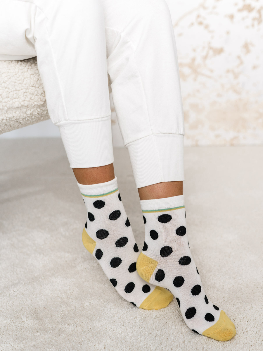 Bijele ženske čarape marke Bolf X20349-4 uljepšat će svaki outfit i njegovati vaša stopala. Izrađena od 100% pamuka. Čarape savršeno prianjaju uz nogu i ne stvaraju neugodne ogrebotine ili ranice tijekom hodanja. Rebrasta manšeta na vrhu sprječava klizanje i bolje prianja uz nogu. Izgledat će sjajno uz svaki stil i za svaku priliku. Vrijedi ih nositi uz traperice i pulover ili sportski komplet i sportske cipele. Set sadrži pet pari čarapa u različitim bojama i uzorcima.