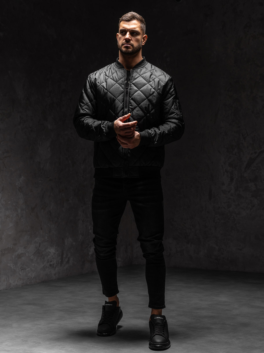 Muška crna prošivena bomber jakna Bolf MY-01A1 moderan je klasik među bomber jaknama. Jakna je, zbog svoje jednostavnosti i kvalitete izrade, bezvremenska i može se nositi mnogo sezona. Bomber jakna savršeno se uklapa u najnovije trendove, izrađena je od tkanine ugodne na dodir. Prošivena je rombovima. Ima mali stojeći ovratnik i kopča se zatvaračem. Rukavi, ovratnik i donji dio jakne završeni su širokim, crnim rupicama. Bomber jakna ima dva praktična vanjska džepa s patentnim zatvaračima. Također ima jedan dodatni džep s patentnim zatvaračem na lijevom rukavu.