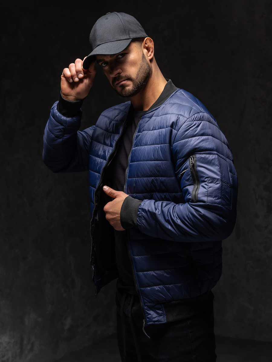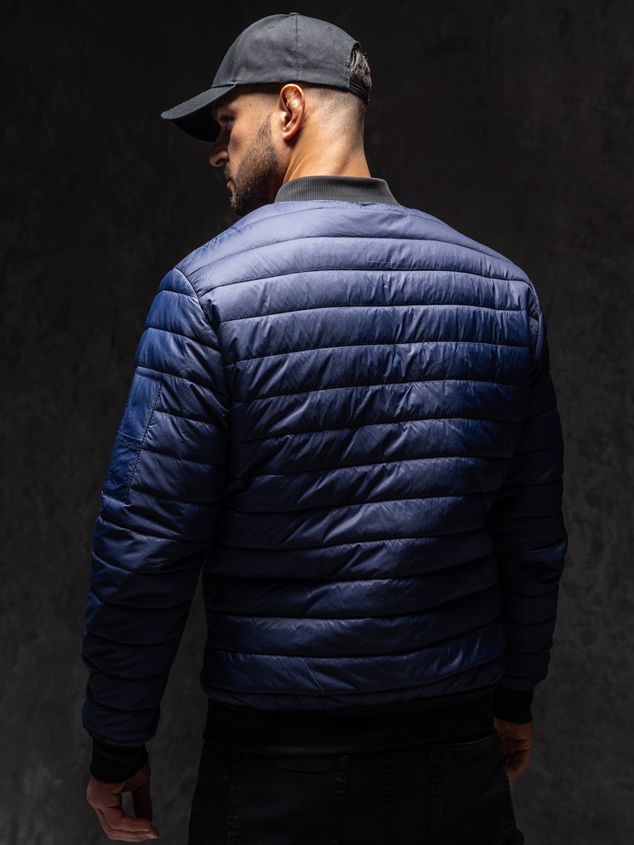 Muška tamnoplava prijelazna bomber jakna Bolf MY-02A1 prošivena je horizontalnim prugama. Kopča se patentnim zatvaračem. Jakna tipa bomber savršena je za sportski i svakodnevni styling, može se nositi kao street outfit. Ima praktičan stojeći ovratnik. Ima dva vanjska džepa koja se kopčaju patentnim zatvaračem i jedan dodatni džep na lijevom rukavu koji se također kopča patentnim zatvaračem. Rukavi, donji dio i ovratnik završeni su kontrastnim crnim manšetama. Jakna je, zbog svoje jednostavnosti i kvalitete izrade, bezvremenska i može se nositi mnogo sezona. Bomber jakna savršeno se uklapa u suvremene modne trendove, izrađen je od ugodne na dodir, lagane i tople tkanine. Jakna u sportskom stilu bit će savršena za hladnije dane, rano proljeće i jesen. Dostupna je u širokoj paleti boja što je čini lakom za kombiniranje s drugim komadima odjeće.