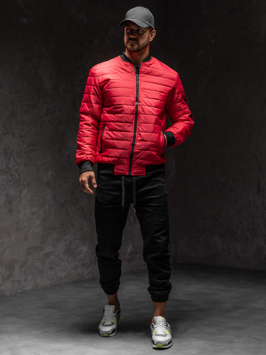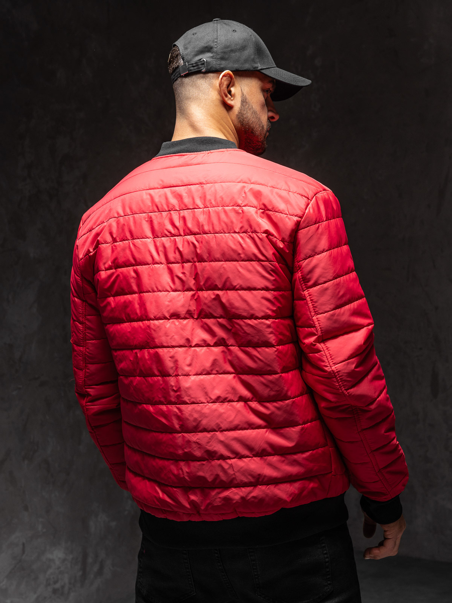 Muška crvena prijelazna bomber jakna Bolf MY-02A1 prošivena je horizontalnim prugama. Kopča se patentnim zatvaračem. Jakna tipa bomber savršena je za sportski i svakodnevni styling, može se nositi kao street outfit. Ima praktičan stojeći ovratnik. Ima dva vanjska džepa koja se kopčaju patentnim zatvaračem i jedan dodatni džep na lijevom rukavu koji se također kopča patentnim zatvaračem. Rukavi, donji dio i ovratnik završeni su kontrastnim crnim manšetama. Jakna je, zbog svoje jednostavnosti i kvalitete izrade, bezvremenska i može se nositi mnogo sezona. Bomber jakna savršeno se uklapa u suvremene modne trendove, izrađen je od ugodne na dodir, lagane i tople tkanine. Jakna u sportskom stilu bit će savršena za hladnije dane, rano proljeće i jesen. Dostupna je u širokoj paleti boja što je čini lakom za kombiniranje s drugim komadima odjeće.