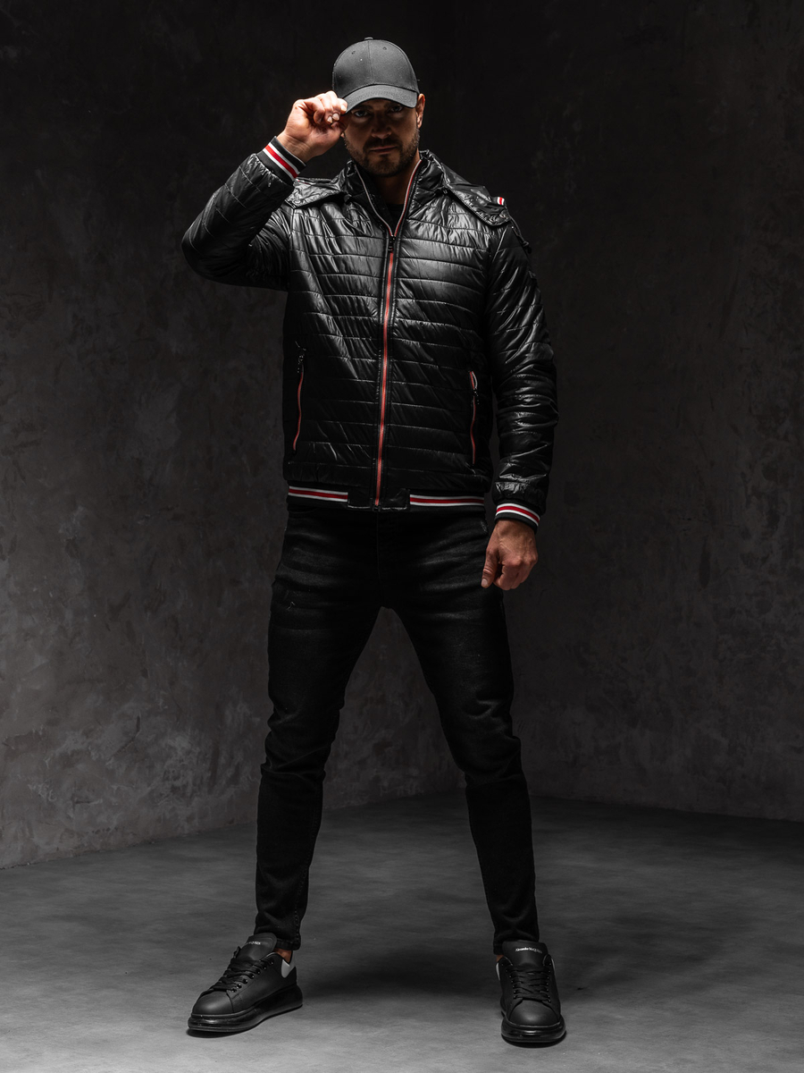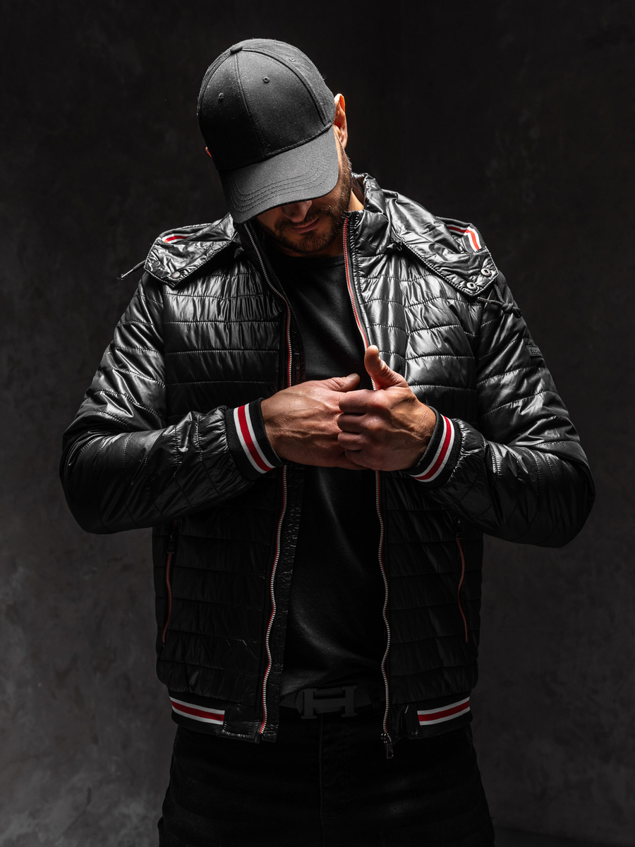 Crna prošivena prijelazna muška jakna Bolf 6191 ima originalne ukrase na manšetama i kapuljači, što je čini prepoznatljivom i uočljivom. Jakna ima moderne vodoravne prošivenja po cijeloj površini. Zakopčava se patentnim zatvaračem i ima stojeći ovratnik. Rukavi, ovratnik i donji dio jakne završeni su širokim, crnim rupicama, sa bijelo crvenim ukrasima, šta dodaje jakni sportski karakter. Imaju dva praktična vanjska džepa s patentnim zatvaračima. Odvojiva kapuljača, podesiva vezicom
