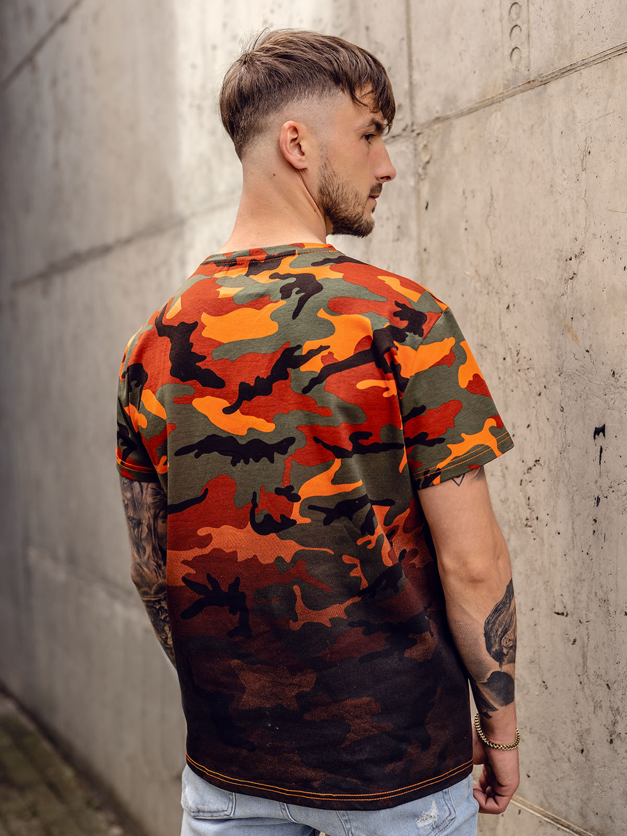 Zelena i narančasta muška camo majica s printom Bolf S808A1 dizajnirana je za muškarce koji cijene hrabrost i originalnost u svom stilu. Majica kratkih rukava ima moderan camo uzorak kao i praktičan okrugli izrez. Majica je stilizirana kao ombre. Sastoji se od 65% pamuka i 35% poliestera, što majicu čini rastezljivom i savršeno pristaje uz figuru. Rukavi i donji dio su obrubljeni koncem koji savršeno odgovara bojama majice.