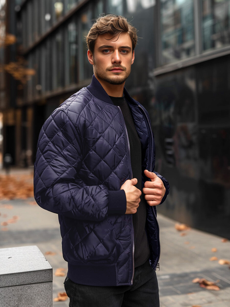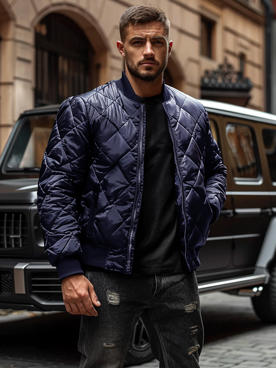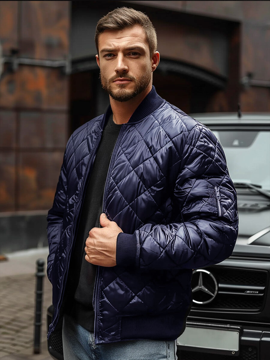 Mornarsko plava prijelazna muška prošivena bomber jakna marke Bolf MY-01A2 moderan je klasik među bomber jaknama. Jakna je, zbog svoje jednostavnosti i kvalitete izrade, bezvremenska i može se nositi mnogo sezona. Bomber jakna savršeno se uklapa u najnovije trendove, izrađena je od tkanine ugodne na dodir. Prošivena je rombovima. Ima mali stojeći ovratnik i kopča se zatvaračem. Rukavi, ovratnik i donji dio jakne završeni su širokim, crnim rupicama. Bomber jakna ima dva praktična vanjska džepa s patentnim zatvaračima. Također ima jedan dodatni džep s patentnim zatvaračem na lijevom rukavu.
