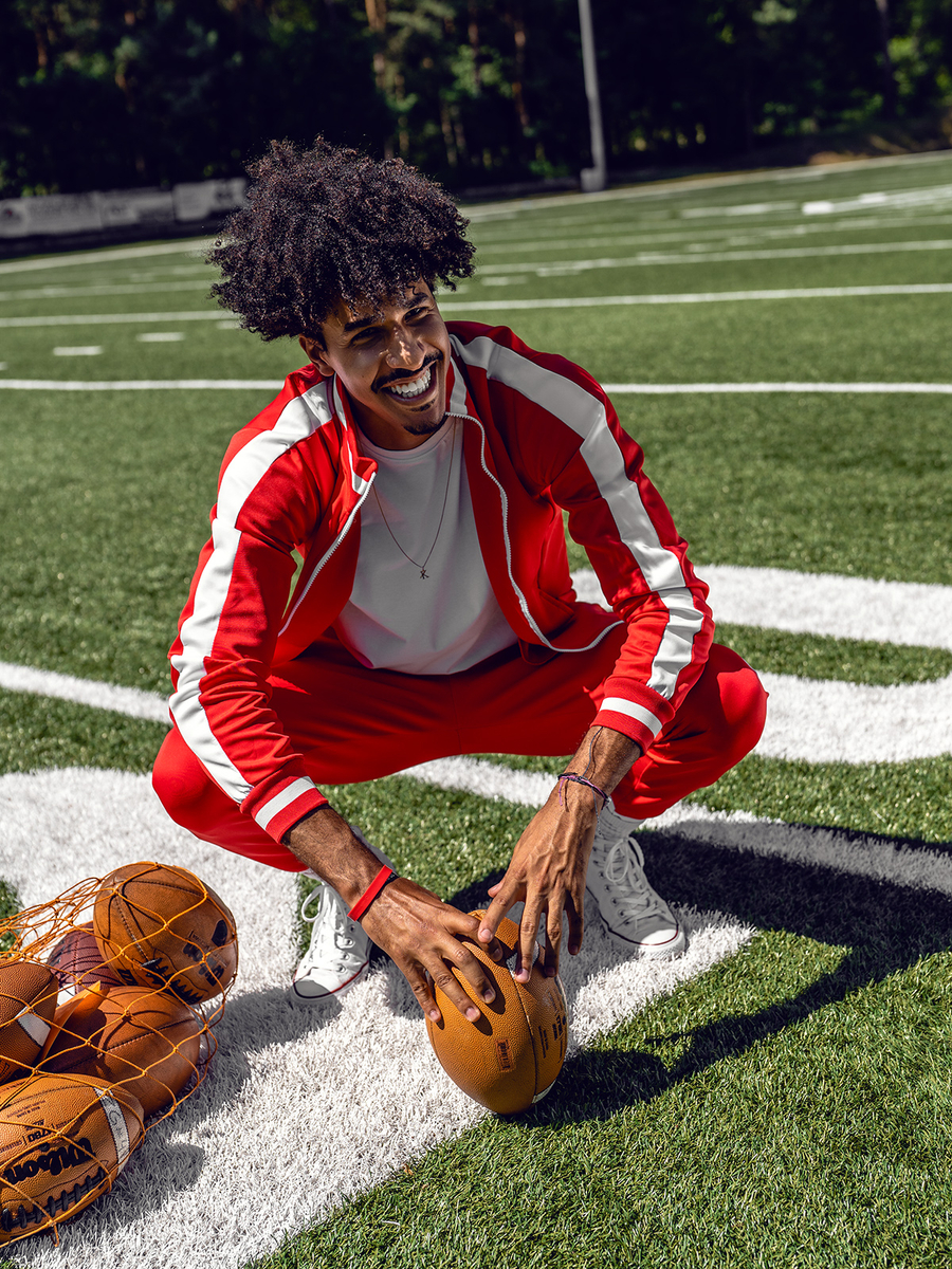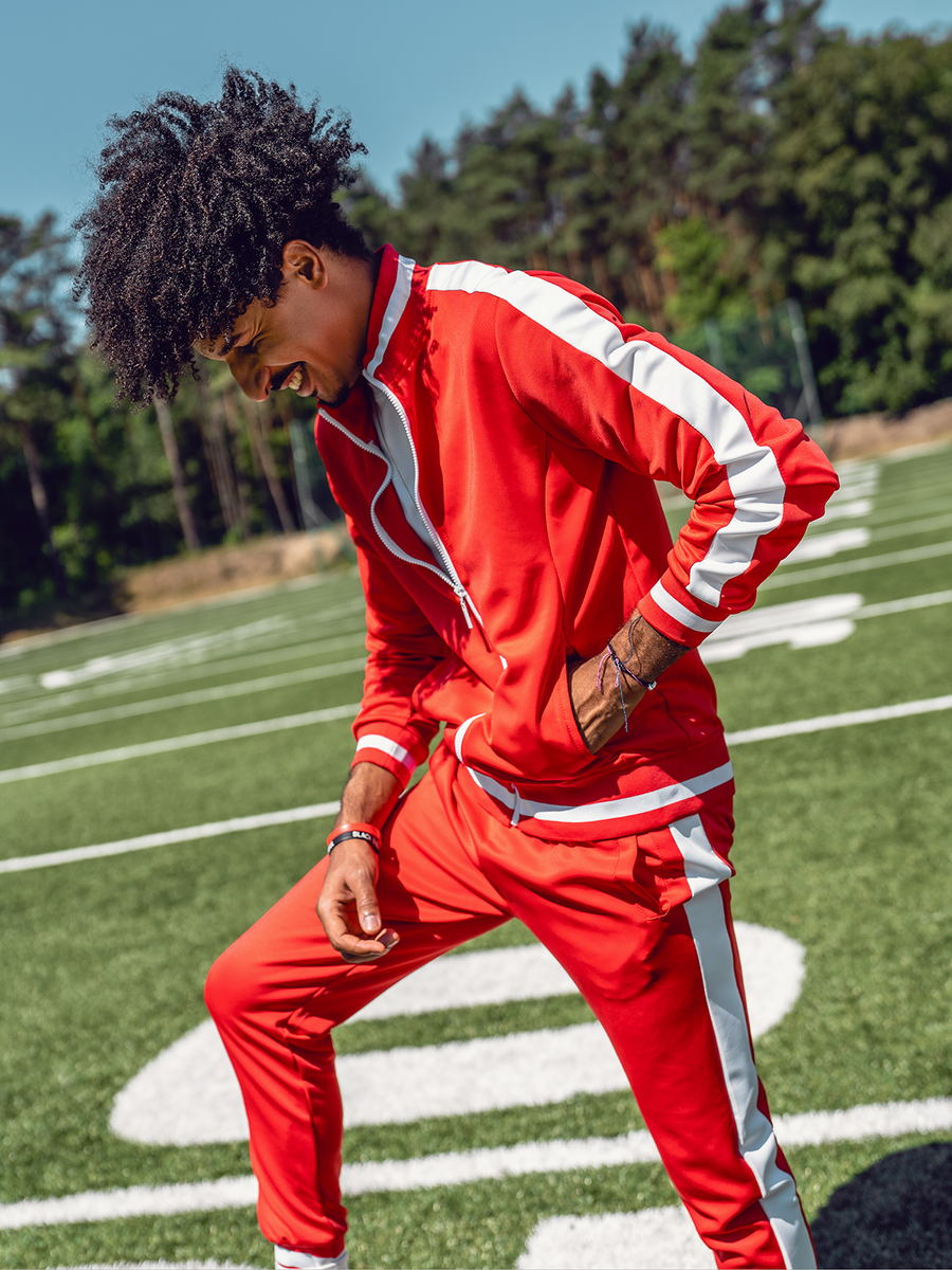 Crvena muška trenirka Bolf 8C99A proizvod je koji osigurava praktičnost i udobnost i tijekom najzahtjevnijih treninga. Komplet uključuje duks s patentnim zatvaračem i hlače. Trenirka ima stojeći ovratnik, dok su hlače podesive u struku pomoću jake vezice i špage. Jednostavan, uklopljen kroj daje im sportski izgled. Set ima četiri praktična džepa: dva bočna džepa bez kopče na trenirci i dva vanjska džepa na hlačama. Komplet trenirke može biti univerzalna osnova za izradu svakodnevnog ili sportskog stila. I trenirka i hlače mogu se kombinirati s drugim odjevnim predmetima, stvarajući nove odjevne kombinacije. Komplet će savršeno pristajati uz majicu i sportsku jaknu.