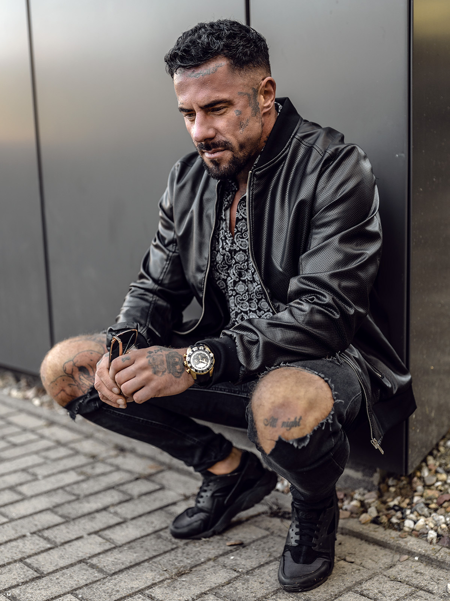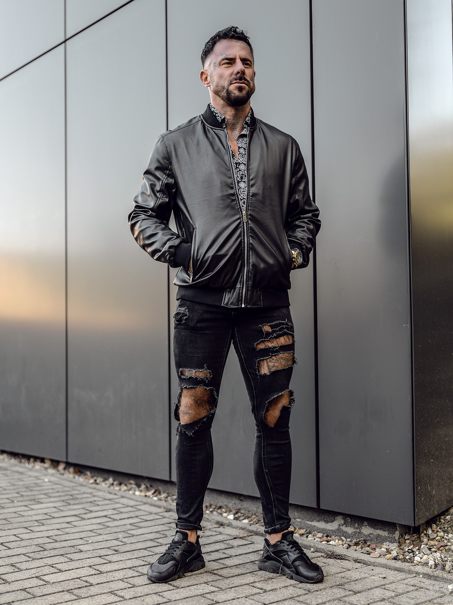 Crna muška kožna jakna Bolf 7110A2 klasičnog je ravnog kroja. Kopča se patentnim zatvaračem i ima stojeći ovratnik s rebrastim obrubom. Dva vanjska džepa s patentnim zatvaračima i jedan unutarnji džep daju mu praktičan karakter. Donji dio i rukavi završeni su rebrastom manžetom koja pruža toplinu i zaštitu od vjetra. Kožna jakna je univerzalnog kroja i casual stila, što je čini prikladnom za svaku priliku. Izrađena je od od dva kombinirana materijala, ekološke kože. Izvrsno će izgledati u kombinaciji s joggericama, trapericama ili u ležernijem stilu s hlače trenirke.