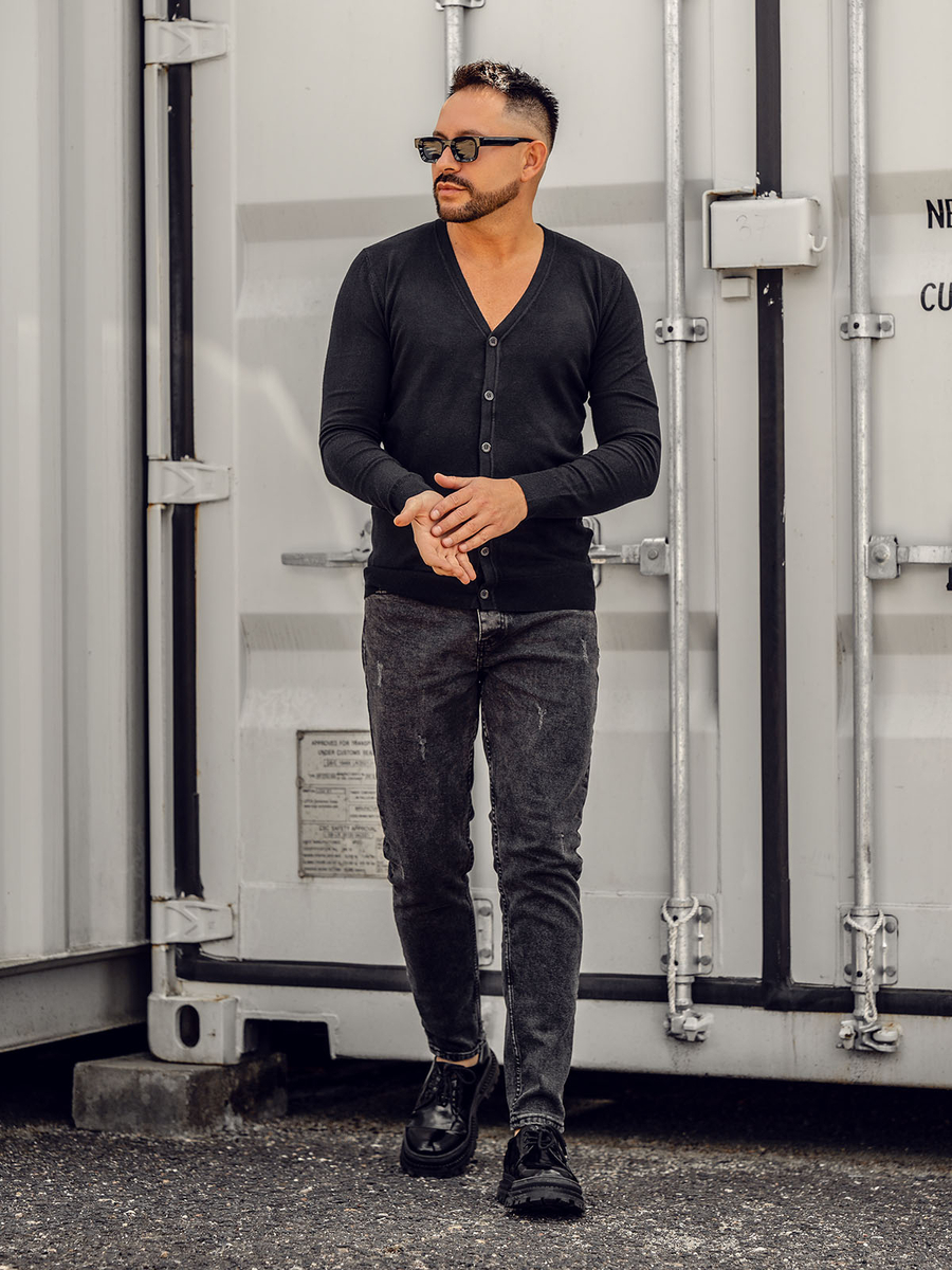 Crni muški kardigan Bolf YY06A savršen je izbor za muškarce koji cijene klasičnu eleganciju. Kopča se gumbima, a rukavi i dno završeni su rupicama. Zahvaljujući svojoj fleksibilnosti, proizvod se prilagođava svakoj figuri. Namijenjen je ljubiteljima svakodnevnog stila. Savršeno za šetnju, sastanak s prijateljima ili izlazak u grad. Izrađen je od 32% akrila, 27% poliestera, 23% najlona i 18% viskoze. Izvrsno će izgledati sa trapericama ili hlačama od tkanine.